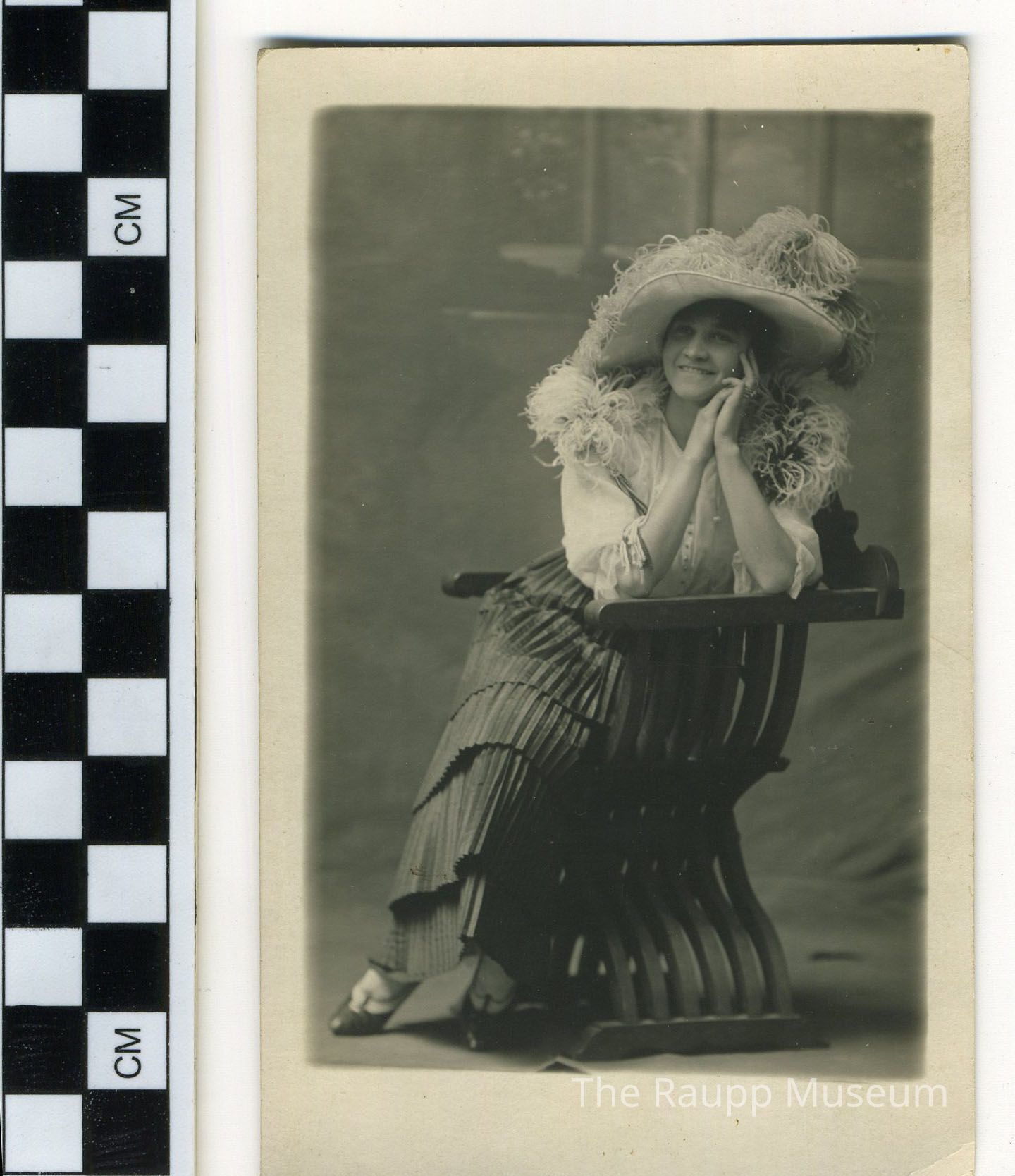 Black and white professional print with white border printed on a postcard. Image of Ann Ackermann sitting in an x-chair with both elbows resting on a chair arm. She is wearing a long, tiered, pleated skirt and white blouse. She is also wearing a large, feathered hat with a wide brim. Professional studio backdrop in the background. reverse side has postcard text with a split back and handwritten ink text on left margin edge: "Ann Ackerman 1910."Relationships