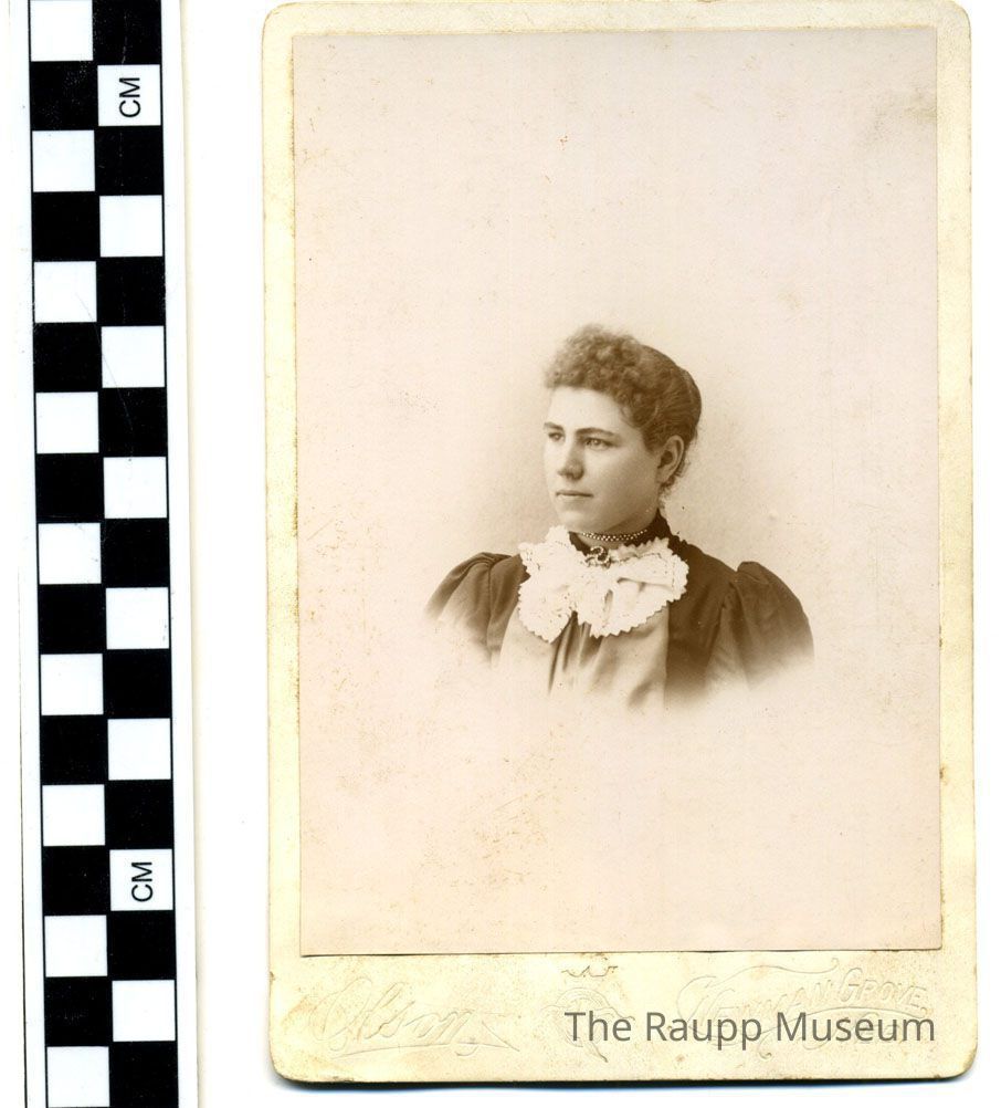 Black and white image with sepia tones mounted to off-white cabinet card. Professional portrait image of one of Anthony Weidner's wives (either Anna Winkler or Clara Stiebley). She is wearing a large white bow collar with rhinestone choker and rhinestone brooch. She has curled bangs and hair in a tight bun. reverse handwritten text: "Mrs Tony Weidner deceas'd Neb; Mrs Tone Weidner Neb." Photographer studio information imprinted on the front lower edge of card.Dimensions