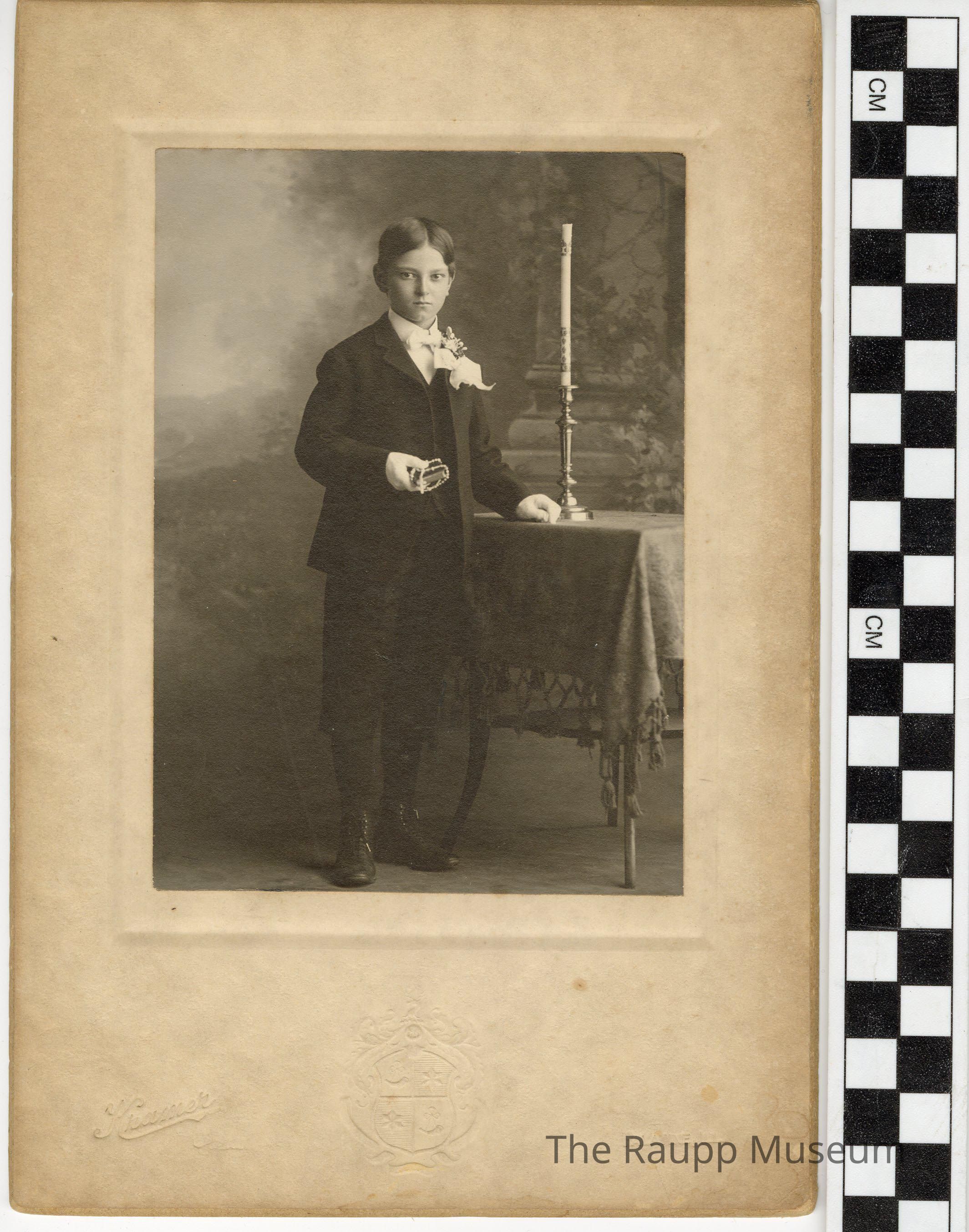 One (1) black and white photograph of Anton "Bernard" Weidner on his First Communion, c. 1902. Anton is standing next to a small wooden table. He is wearing a black three piece suit with a white undershirt and white bowtie, and white gloves. There is a candlestick in a candelabra on the table, and Anton is holding a Bible and Rosary (wrapped around the Bible). He has a boutonniere of white flowers and a white bow on his left side. His hair is parted flat on his head. He is wearing black boots. In the background in a painted column and nature scene.