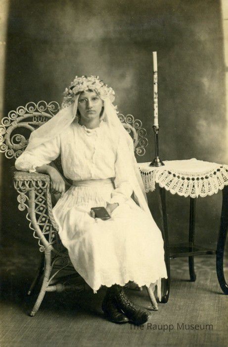 One (1) black and white image, sepia toned of Antonette Weidner. Antonette is wearing a white confirmation dress with long sleeves and a waist band. She has on a floral headpiece with long veil attached. She is holding a small Bible. She is seated in a wicker decorative chair with a table on her left and a candle in a metal stand on the table. There is a white lace placemat on the table. Antonette has on black boots.