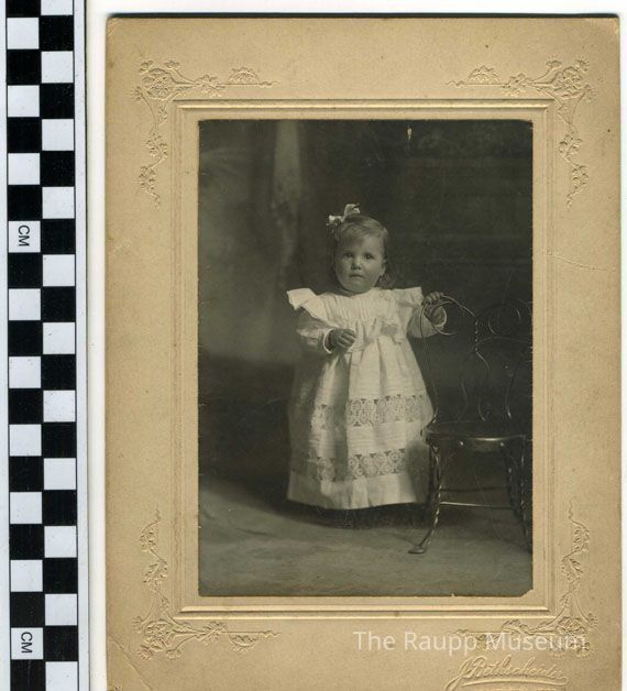 Black and white professional print mounted to a heavy tan card. Card has embossed faux frame and embossed floral motif around the perimeter. Image of a child wearing a white ruffled yoke dress with two horizontal eyelet panels near hem. Child has a small bow in her hair and holding onto a small wire café chair. reverse pencil text inscription "Apolonia Arl Neb."Made/Created