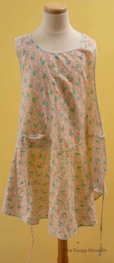 Lightweight cotton bib style apron with orange/pink background with a green floral print. With slightly ruffled skirt and back tie closures. White trim around the edges and around the little pocket in front.