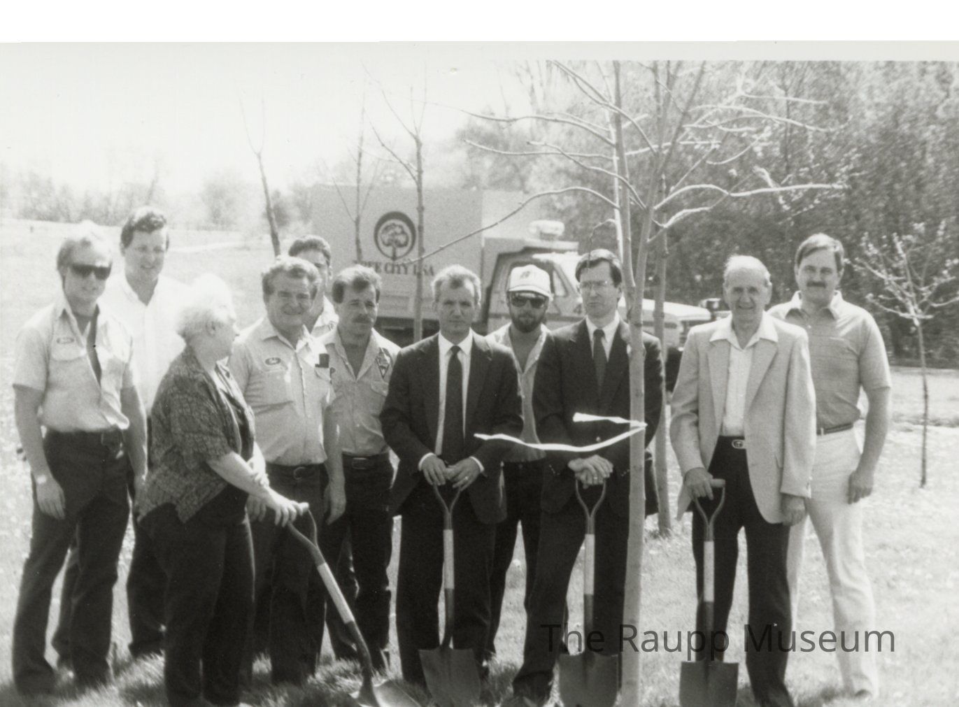 One (1) black and white photograph of Verna Clayton and ten men standing in front of a tree planted on "Tree City USA Arbor Day Tree Planting Ceremony". Behind them is a truck for Tree City USA.Made/Created