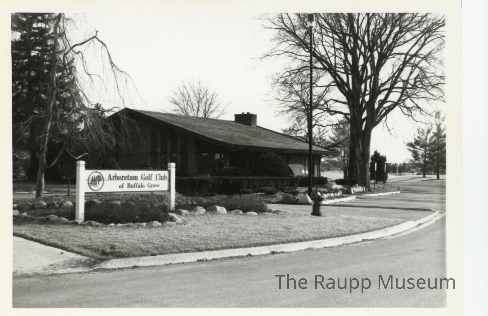 One (1) black and white photograph of Arboretum Golf Club in Buffalo Grove. Picture shows the clubhouse on the left and the sign for the golf club in front.Made/Created