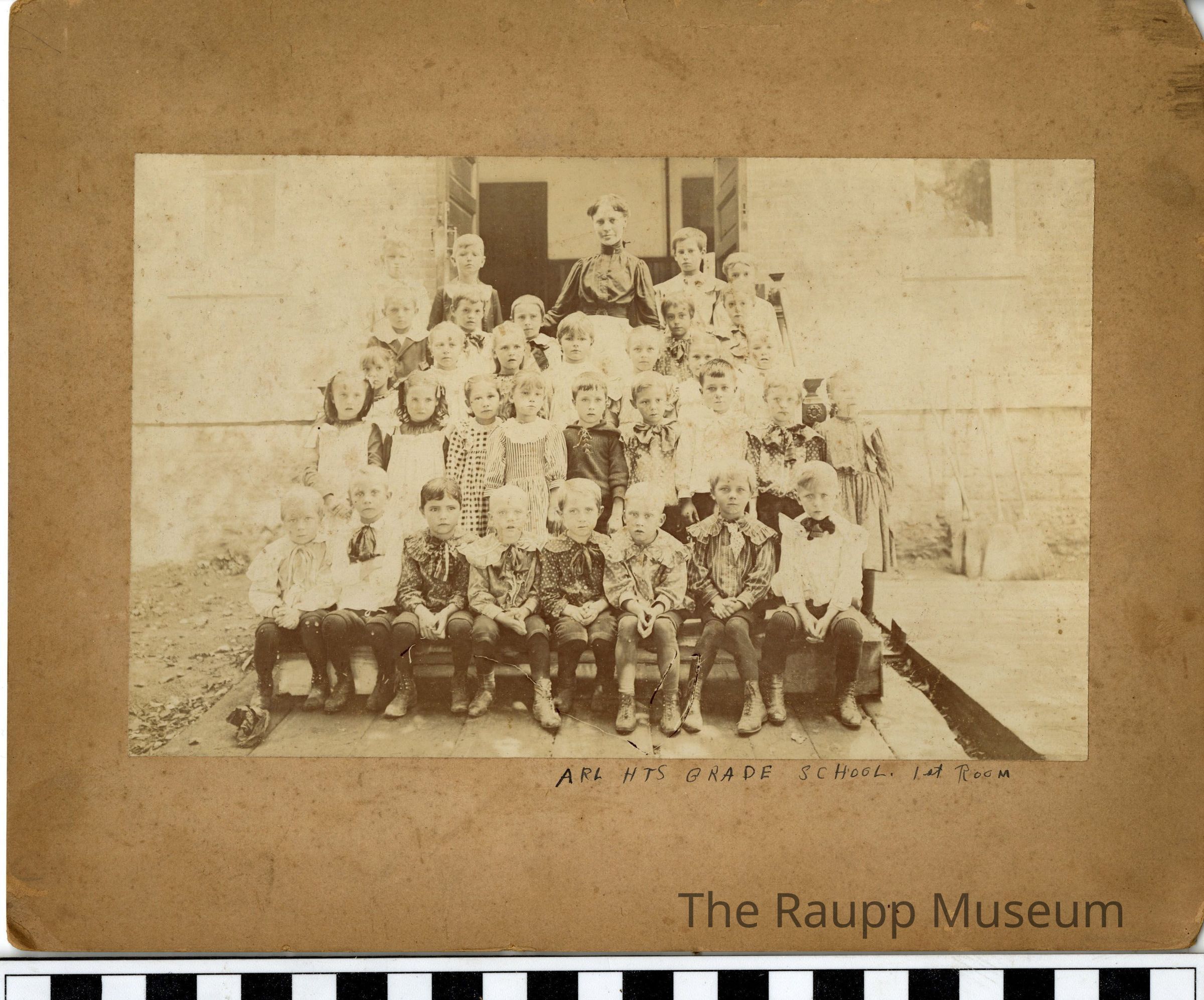 Under the photo is handwritten: "ARL HTS GRADE SCHOOL 1st room". The photo is attached to a brown mat board.Made/Created