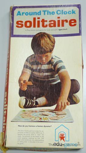 Card game "Around the Clock Solitaire" marked "no.143" and box with separate lid. Set includes cardboard game board, instructions and set of 42 playing cards. Box lid features an image of a child wearing a striped blue shirt playing the game.Dimensions