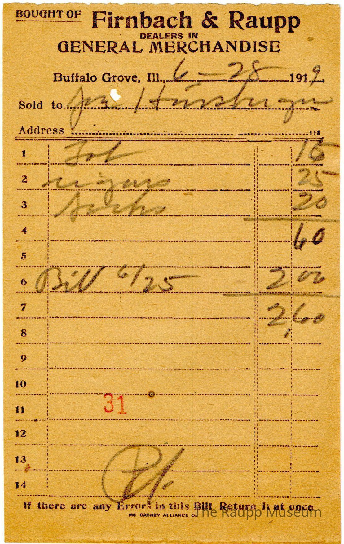 The black text is as follows, Bought of Firnbach and Raupp; Dealers in; General Merchandise; Buffalo Grove Ill.; Sold to; Address; If there are any Errors in this Bill Return it at once; MC CASKEY ALLIANCE O.