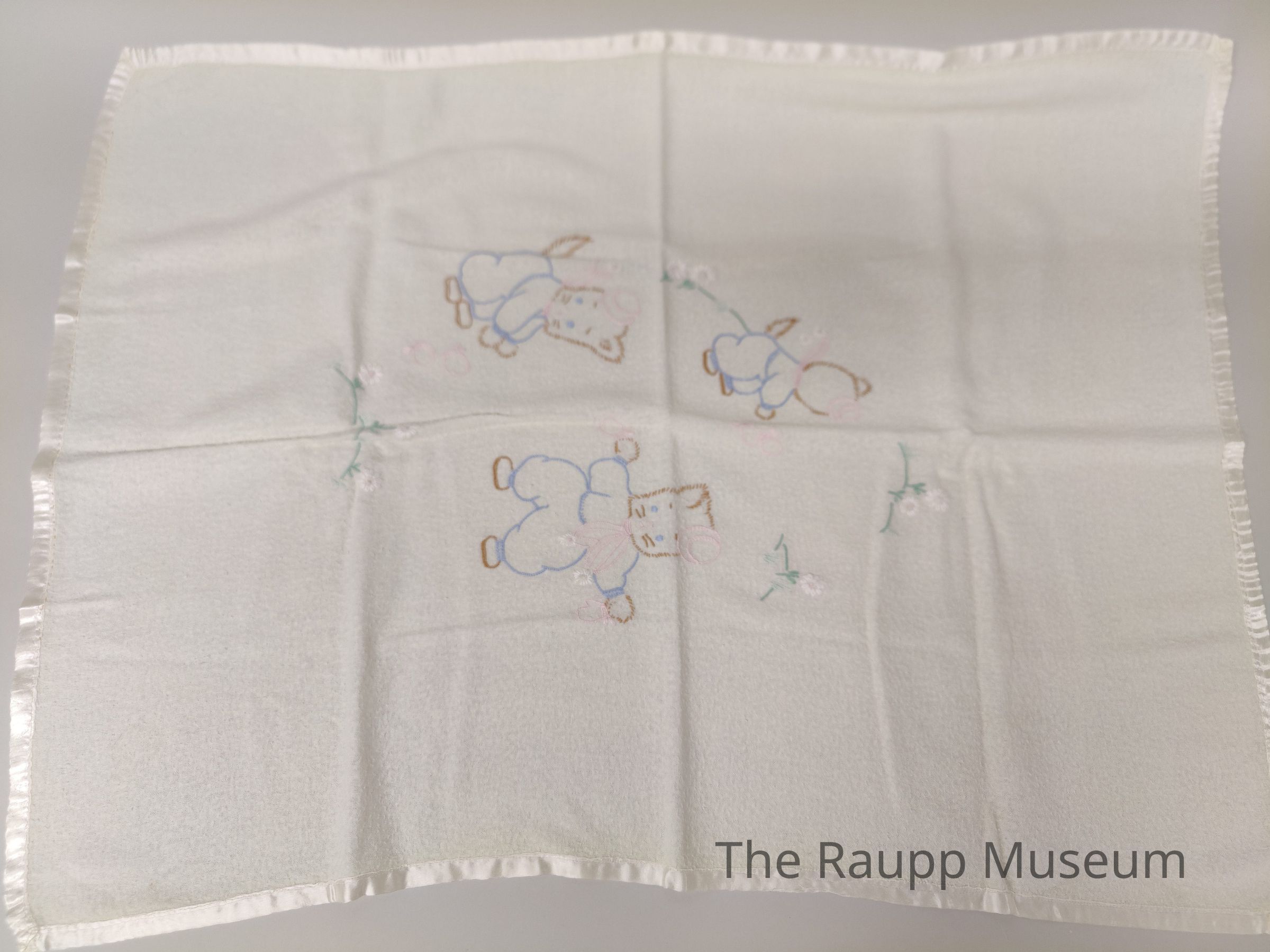One (1) rectangle, yellow baby blanket with embroidered design and satin trim. Satin trim runs around the border of the blanket, is white and 1/2 inch thick. Main body of the blanket is yellow cotton. In the center are three (3) embroidered cats wearing baby clothes. The outline and whiskers of the cats are brown thread; the clothes outline and eyes are blue thread. Each cat has a small pink hat hung over one ear; pink scarf around the neck with white tassels at the end; and pink mittens. The two cats on the lower half are front-facing. The right cat's mittens are dangling off the paws and it appears to be dancing. The left cat has dropped the mittens and is stooping to pick them up. The top cat is facing away, also stooping to pick up dropped mittens. Framing the cats is a segmented border of grass and flowers like they are in a meadow or on a hill. The grass and leaves are green thread. The flowers have white petals with a pink center, identical to the tassels at the ends of the scarves.Made/Created