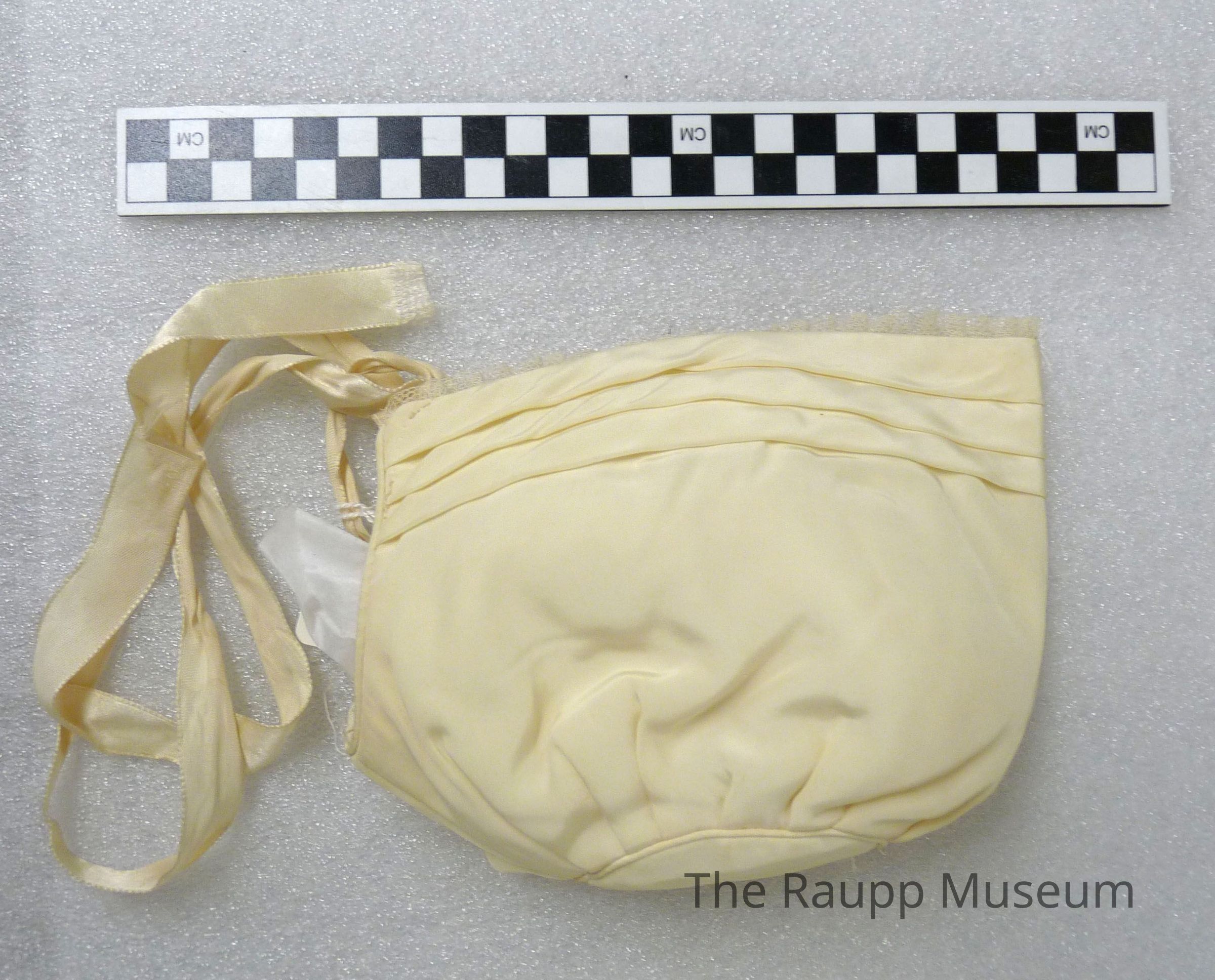 One (1) white satin baby bonnet. 1/4" width of fine lace (netting) is on edge - from edge are three tucks, front gathers to circular piece at back. Two front ties at neck.