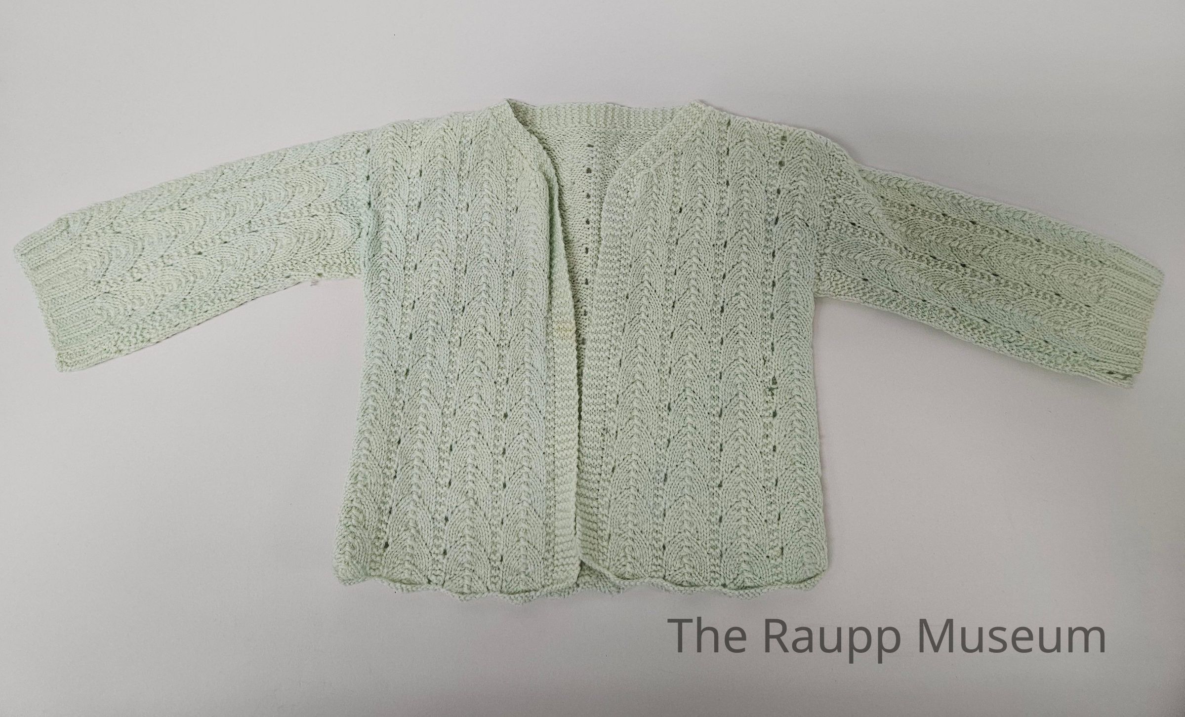 One (1) long-sleeved, green baby cardigan. Knit sweater bottom-up with seams at the arms. Main pattern is a series of overlapping arches pointing towards the top. No buttons or ribbons. Hem is scalloped. Sleeves have the same arch pattern pointing towards the body with banded cuffs.Dimensions