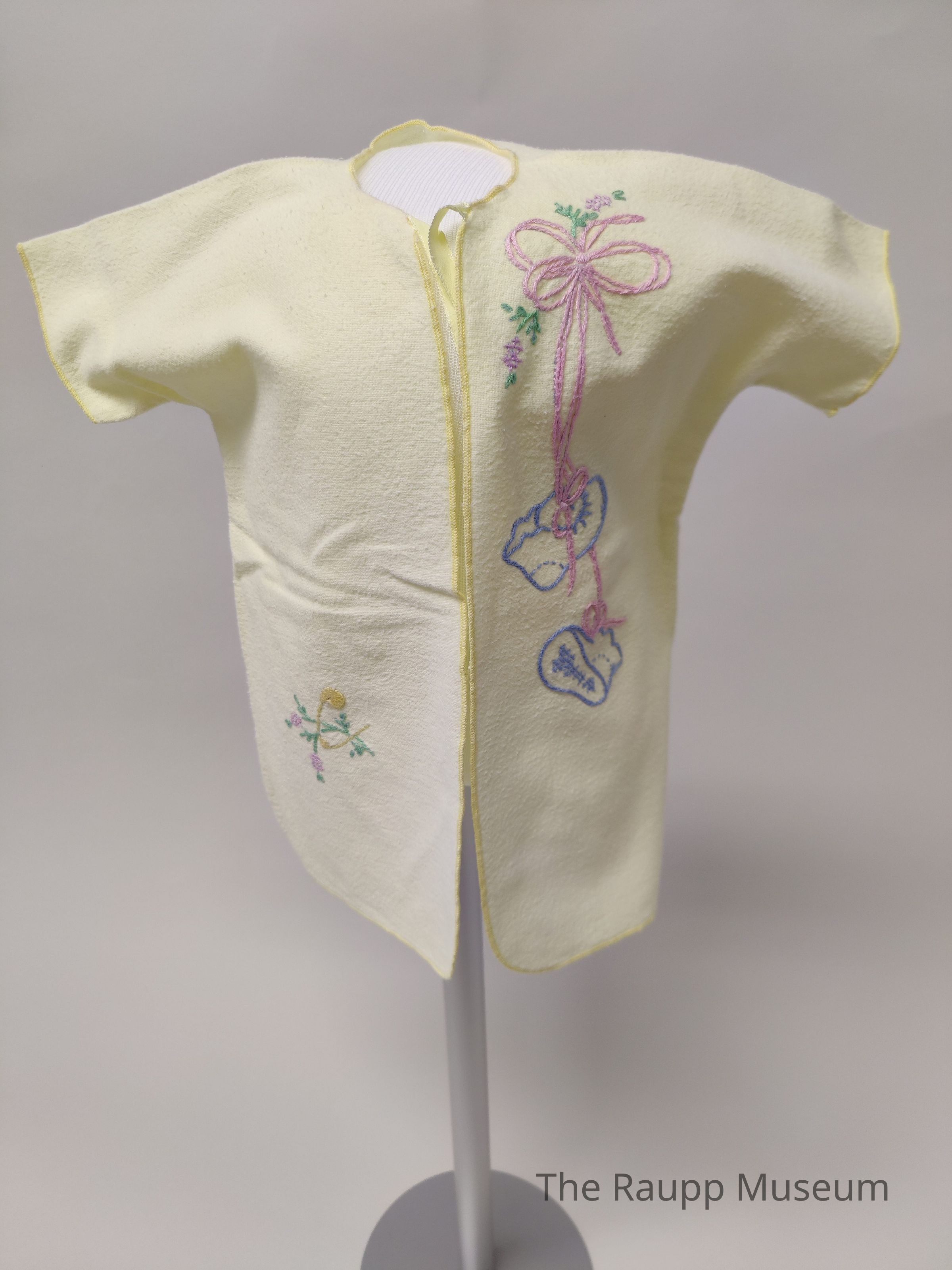 One (1) yellow baby coat with embroidery on the front. The front is open with no zipper or buttons and is tied with a ribbon at the neckline. The left side has an embroidery pattern of purple flowers and green leaves at the top tied with a pink string bow. The string extends down the front of the coat and is tied to two (2) blue shoes. The pattern on the right side is at the bottom of the coat with the same purple flowers and green stem and leaves with a yellow safety pin embroidered over top. The coat is short-sleeved and the reverse side is blank.