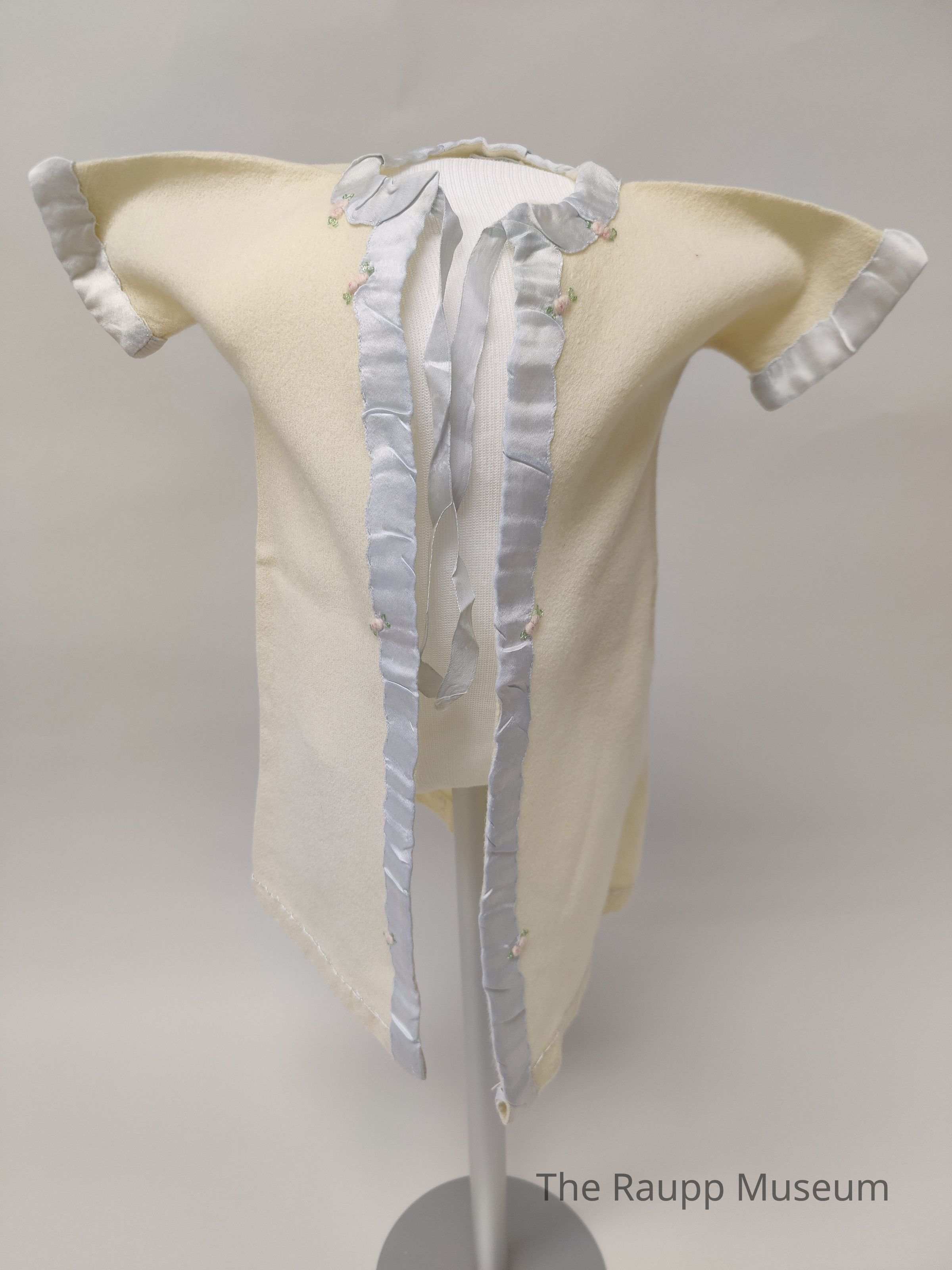 One (1) beige and blue, baby day gown produced by the Marshall Field Company. Main body is beige. Short-sleeved. Cuffs of sleeves, collar, and front center line bordered by blue ribbon. Tied at the top with blue ribbon. Repeating pattern of two pink flowers framed by green leaves runs from the collar down the center line: one set on each side of the collar and then three sets on each side of the center line. The left flower has a dark pink/purple center on all sets. Silver thread line runs three-quarters (3/4) of an inch from the hem. Hem flares out in bell-shape.Dimensions