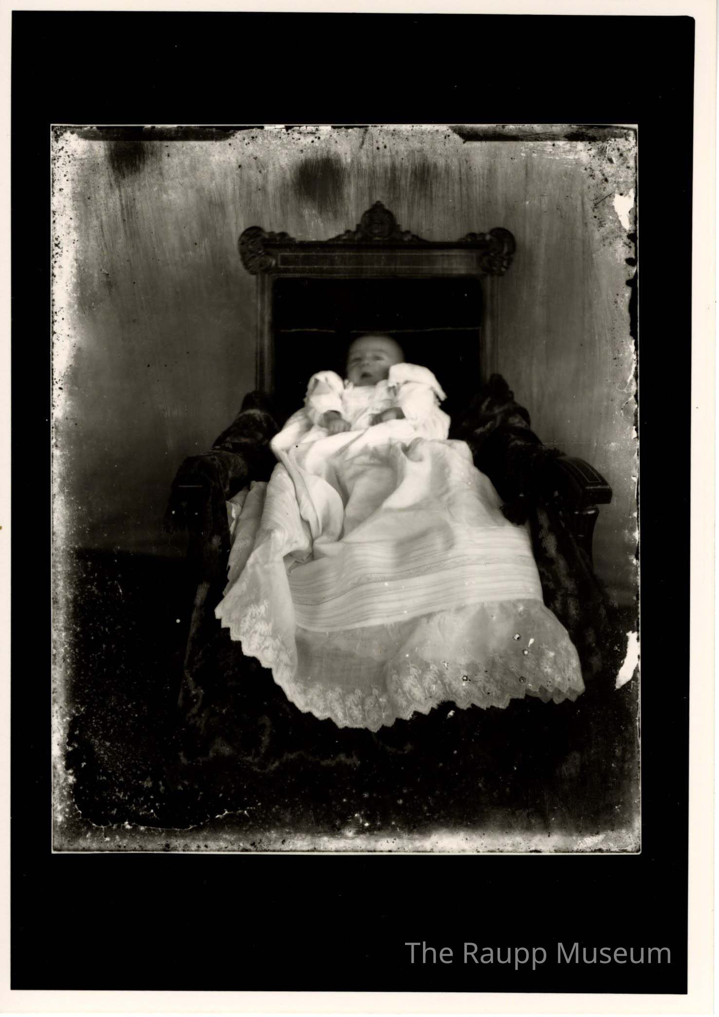 One (1) black and white photo taken from a glass negative. Photo shows a baby in a long white dress with lace on the bottom, laying in a padded dark chair with wooden arms and back.