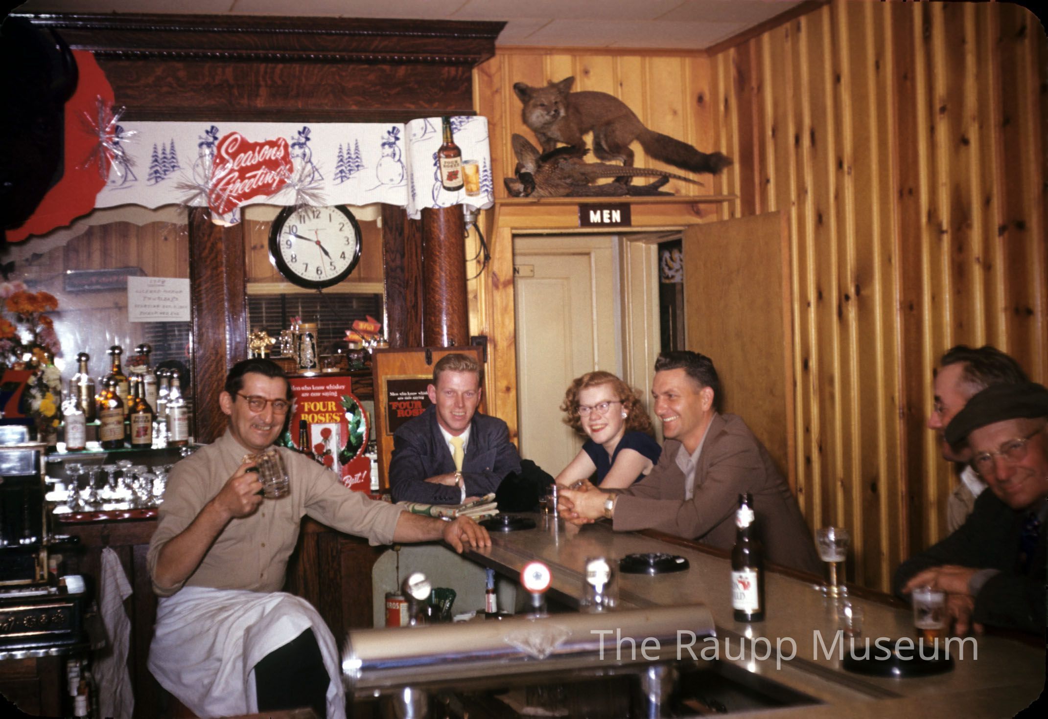 One (1) photographic copy of people seated inside Bill's Buffalo House at the bar. Bill is seated behind the bar with a glass mug and smiling at the camera. There are five people seated at the bar, a young man, young woman, and three men (as you move toward the edge of photo). Above the bar is a "Seasons Greetings" sign, and the men's restroom sign and door is on the right back. Above the sign is a taxidermy fox and pheasant. Photo is labeled "Grandpa, Uncle Carl, Aunt Ginnie".Made/Created