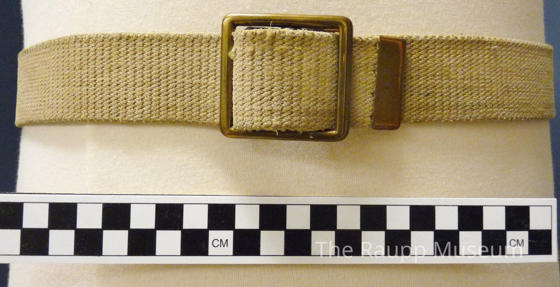 Tan, fibrous canvas military issue belt with slider, square metal buckle. Canvas width: 1.5 inches. Metal tab on end.Relationships