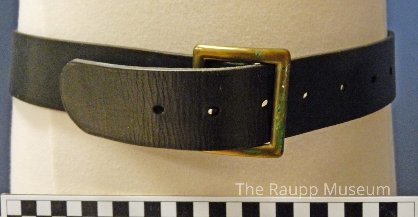 Wide black leather military issue belt with square brass buckle. "W Kiddle" shallowly hand carved into the reverse side of the leather near the buckle end. Seven belt holes, leather width: 1.75 inches.Dimensions