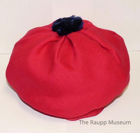 Fuchsia/dark pink tam with blue pom pom. Soft brimless, bonnet cap with fabric gathered at the top of the dome under a blue pom pom. Cap has ribbon band and lining sewn into the interior. Two embroidered tags text on interior: "Original design by madcaps Paris- New York/ Marshall Field & Company/ Hat Bars."