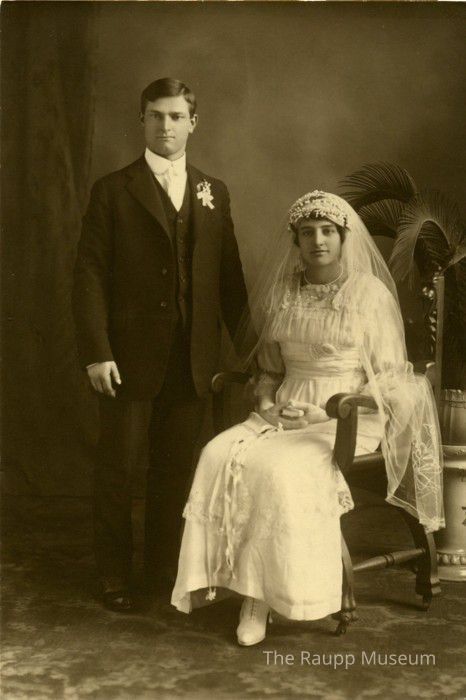 Black and white photographic print with warm brown tones with matte sheen, paper fibers not visible. Image of Bernard Weidner and Mary Leikam. She is seated in a wooden chair on the right side of the image, wearing a white dress without a train, tight waist, puffed sleeved to her elbows, square neck and square lace overlay on skirt that does not extend to the hem; pearl necklace; white boots; and finger length veil with pearl headpiece. Bernard standing on the left next to her wearing a three-piece suit, jacket has two buttons; shirt with a wide round collar; white necktie, small white boutonniere . Studio background with potted plant behind Mary and carpeted floor.Relationships