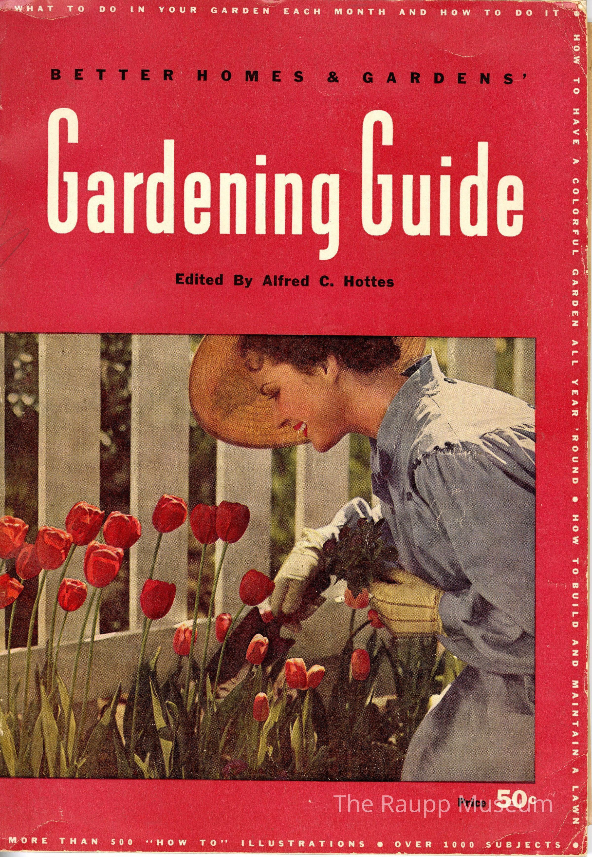One (1) "Better Homes & Garden's Gardening Guide", edited by Alfred C. Hottes. This large paperback book contains illunstrations, and instructions related to over 1000 subjects and plants. The cover is red with white and black text and a color photo of a woman planting roses. Stuck inbetween the pages are three pages from "The Farmer's Wife" magazine, from March, 1949.
