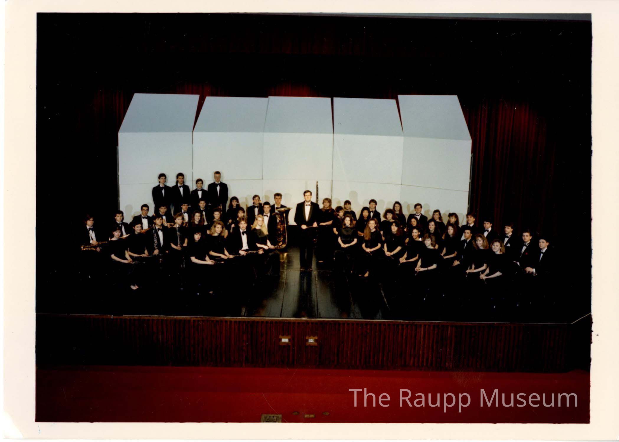 One (1) color photograph of the Buffalo Grove High School Band. Photo taken while band is in black dress uniforms on stage with white background and black and red stage. Conductor in center.Made/Created