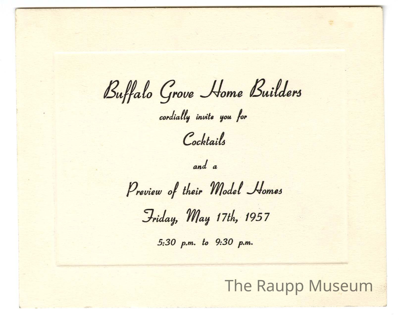 One (1) cardstock printed invitation to the Buffalo Grove Home Builders cocktail party to preview their model homes, on May 17, 1957 from 5:30pm-9:30pm. Card is white with black curvise text. It is indented border around the outside.Archive Items Details