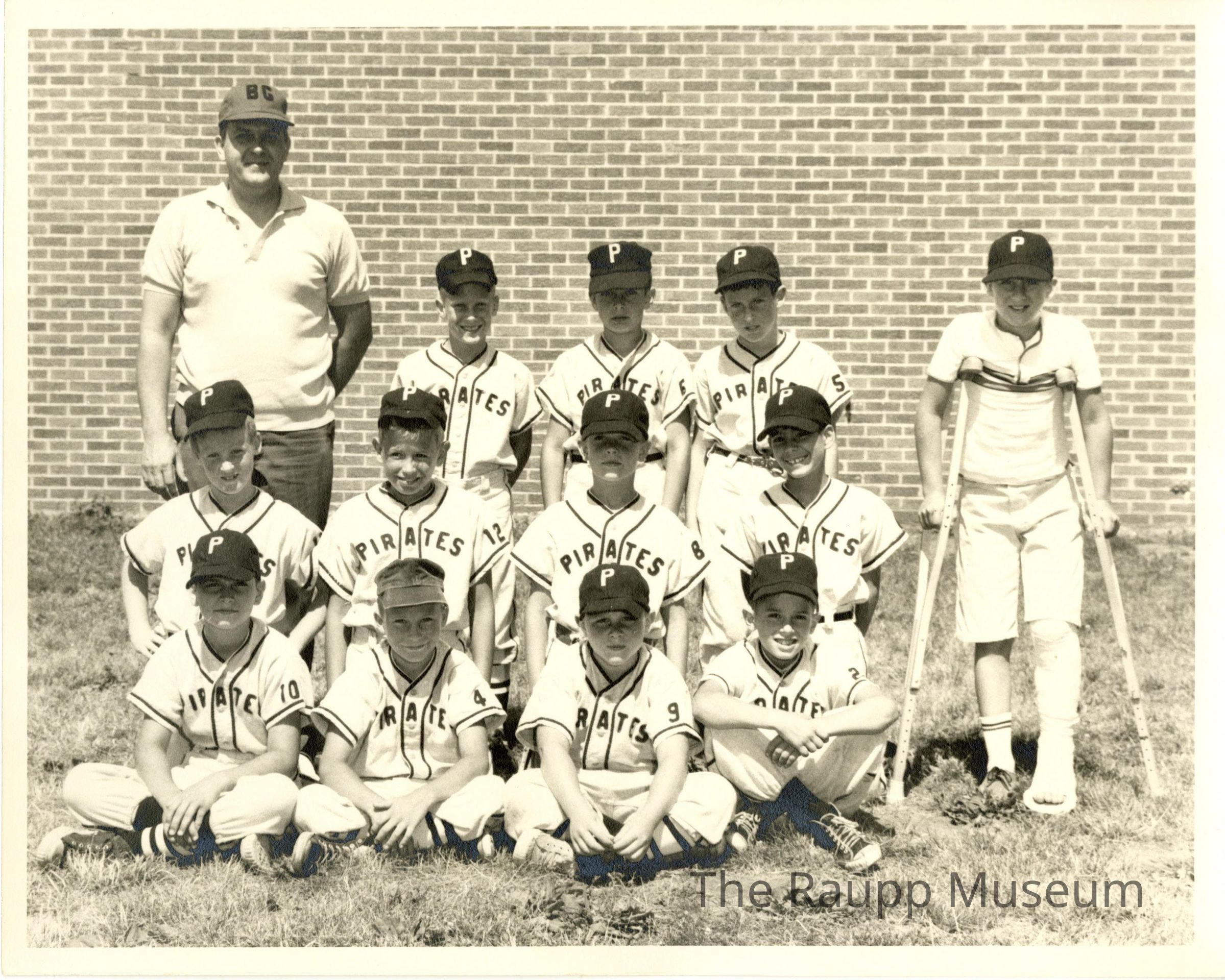 One (1) black and white photograph of a boys baseball team in Buffalo Grove. Found in folder with another photo that had "Doug Reid 1967 summer" written on the back. This photo has three rows of boys in white and black uniforms (one boy on stilts), and the coach standing on the back left. They are the "pirates". There is a brick building behind them.