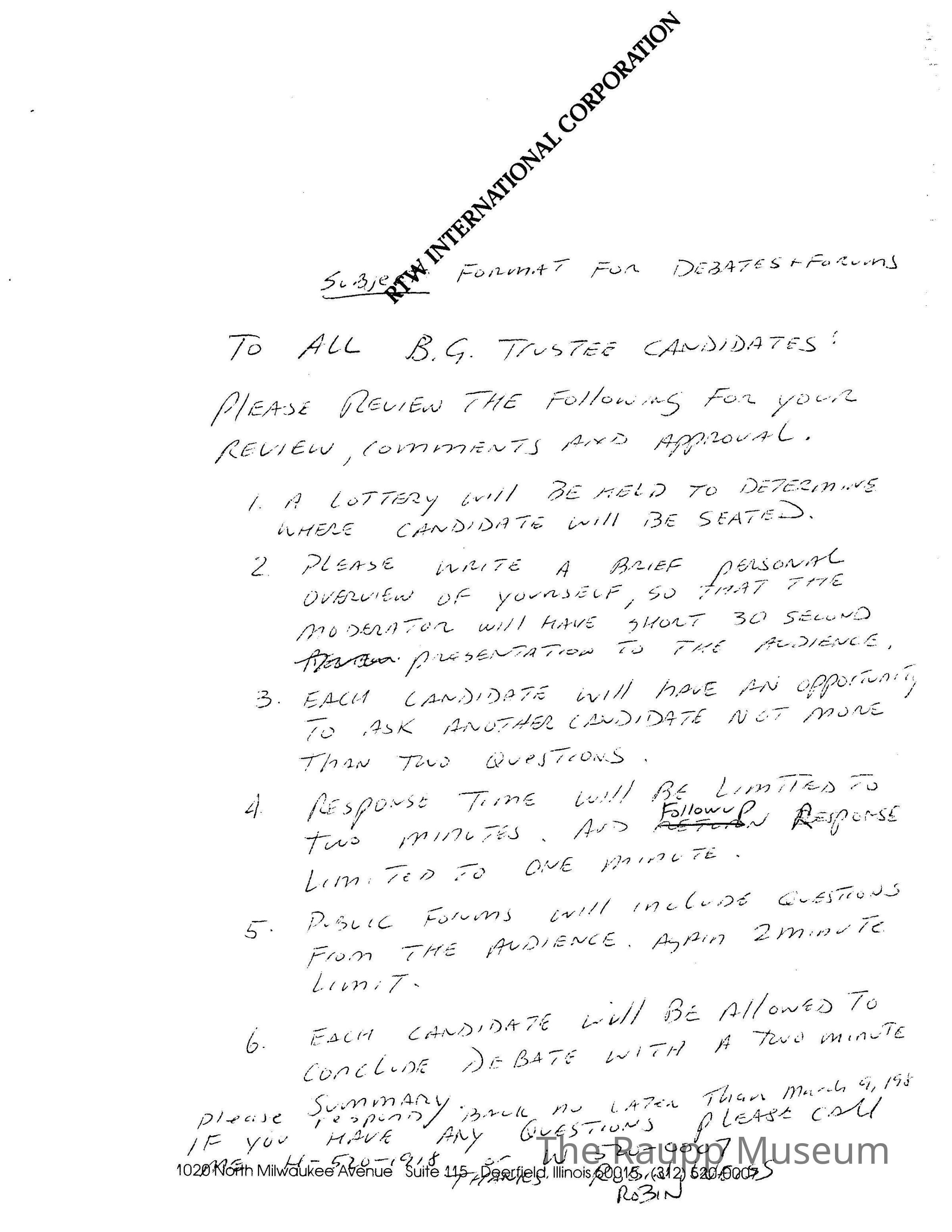 One (1) handwritten copied note on paper from the RTW International Corporation, about the rules for the debate forums for BG Trustee candidates.