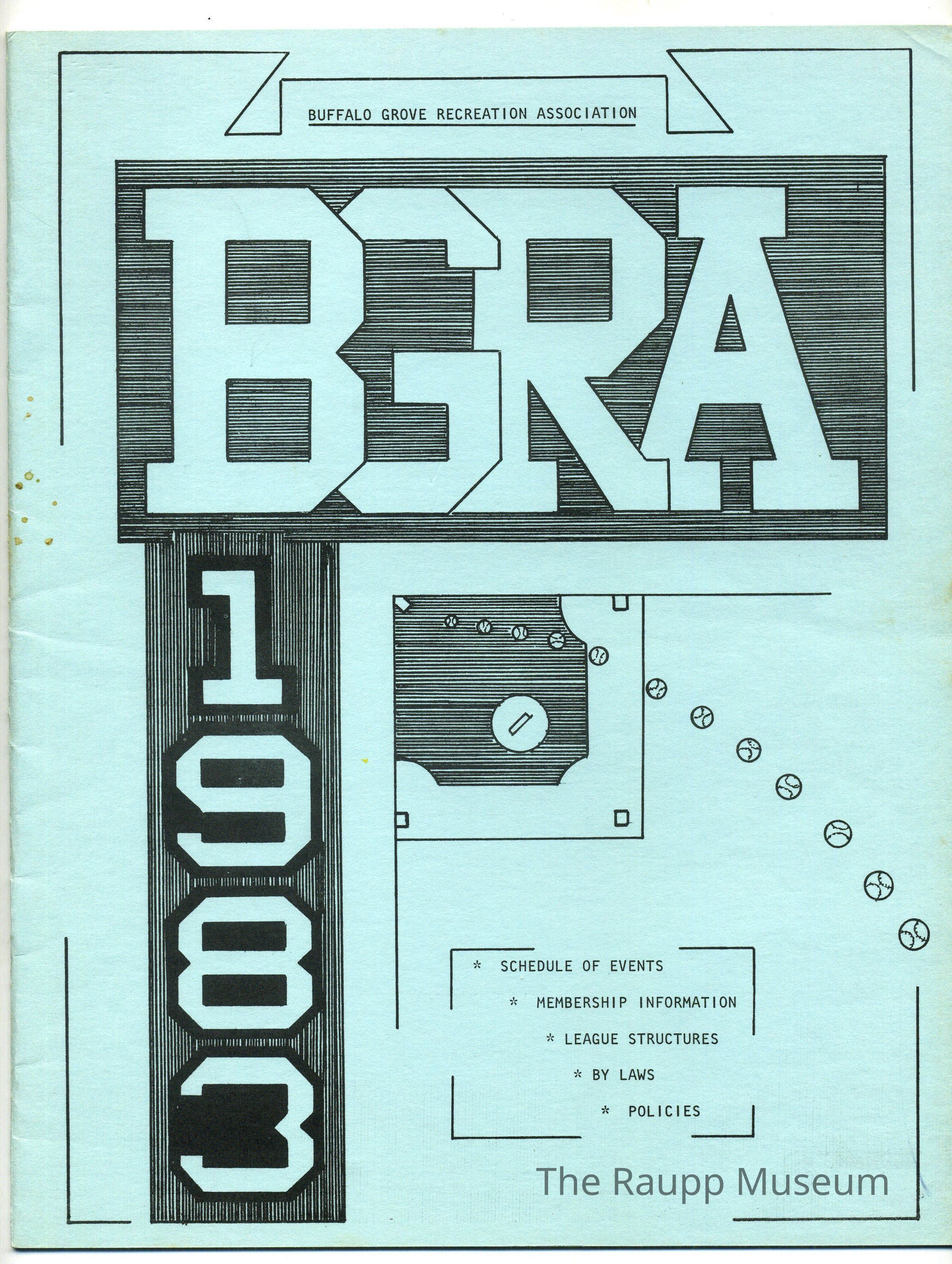 Blue soft cover booklet for the BGRA with vertical crease and staple binding. Front has a black and white illustration of a ballfield and stylized text: BGRA 1983. Reverse cover contains a hand-drawn map of the local area and baseball fields.