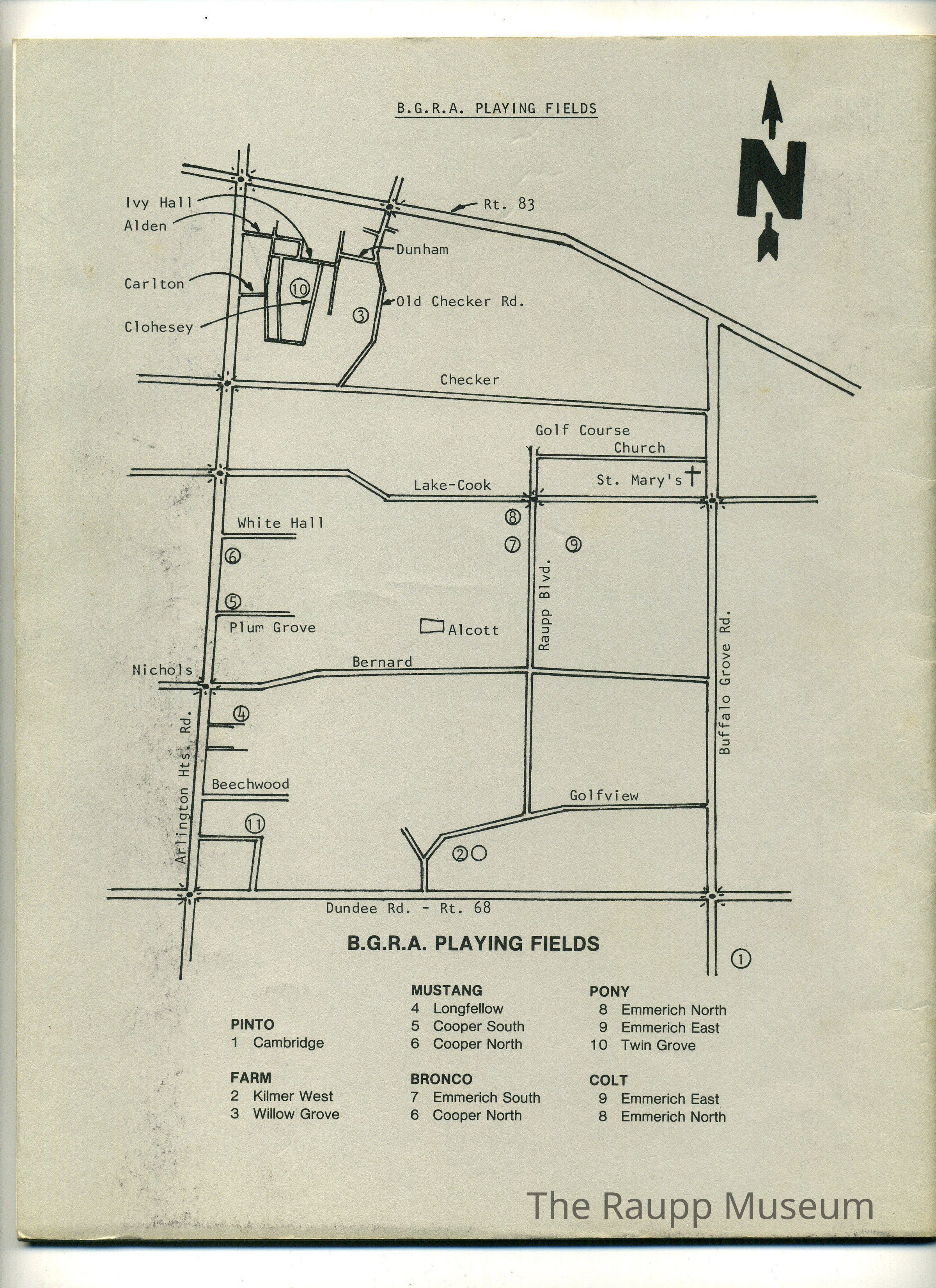 Gray soft cover booklet with horizontally creased spine and staple binding. Front has a black and white illustration of a child wearing a baseball uniform throwing a ball. Text above the illustration: "BGRA Baseball Yearbook 1985." Text underneath the illustration: "Schedules; rosters; membership information; league structures; policies & procedures; by laws; Buffalo Grove Recreation Association." Reverse cover contains a hand drawn map of the ball fields.