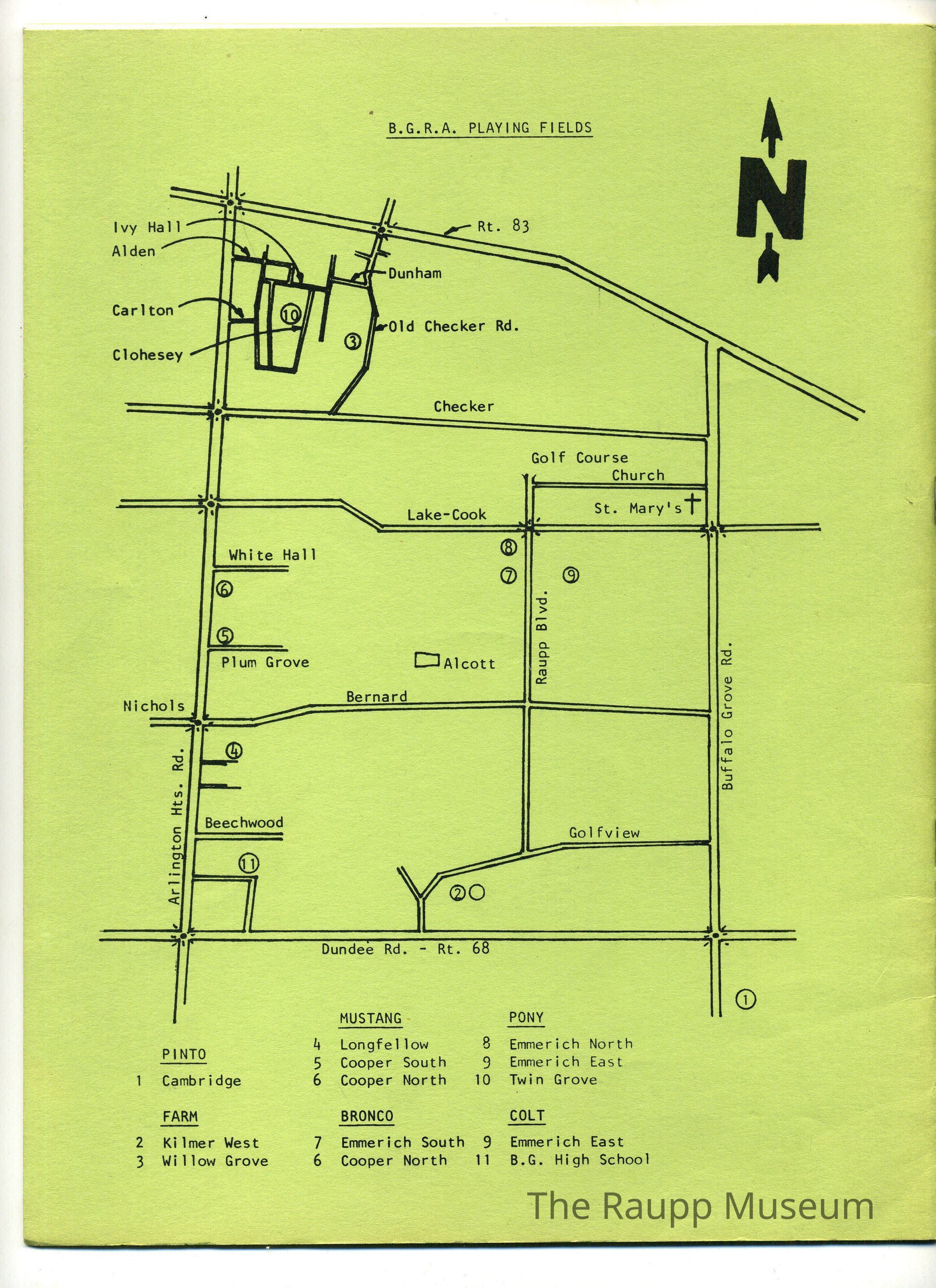 Gray soft cover booklet with horizontally creased spine and staple binding. Front has a black and white illustration of a child wearing a baseball uniform throwing a ball. Text above the illustration: "BGRA Youth Baseball 1987." Text underneath the illustration: "Officers and directors; membership information; league structures; managers' guidelines; by-laws; Buffalo Grove Recreation Association." Reverse cover contains a hand drawn map of the ball fields.