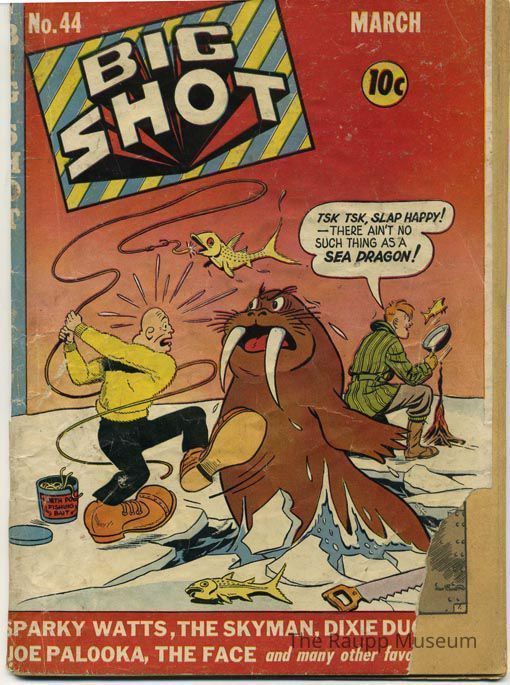 Softcover comic book with vertical bi-fold spine with adhesive binding. Red front cover with the "Big Shot" logo in the upper left corner and color illustration of a walrus. Reverse cover has an ad printed in red and yellow for an "Amazing Forecaster; predicts the weather 24 hours in advance." Comic printed on tan paper with color illustrations. Series of color illustrated cartoons with various characters and scenarios.