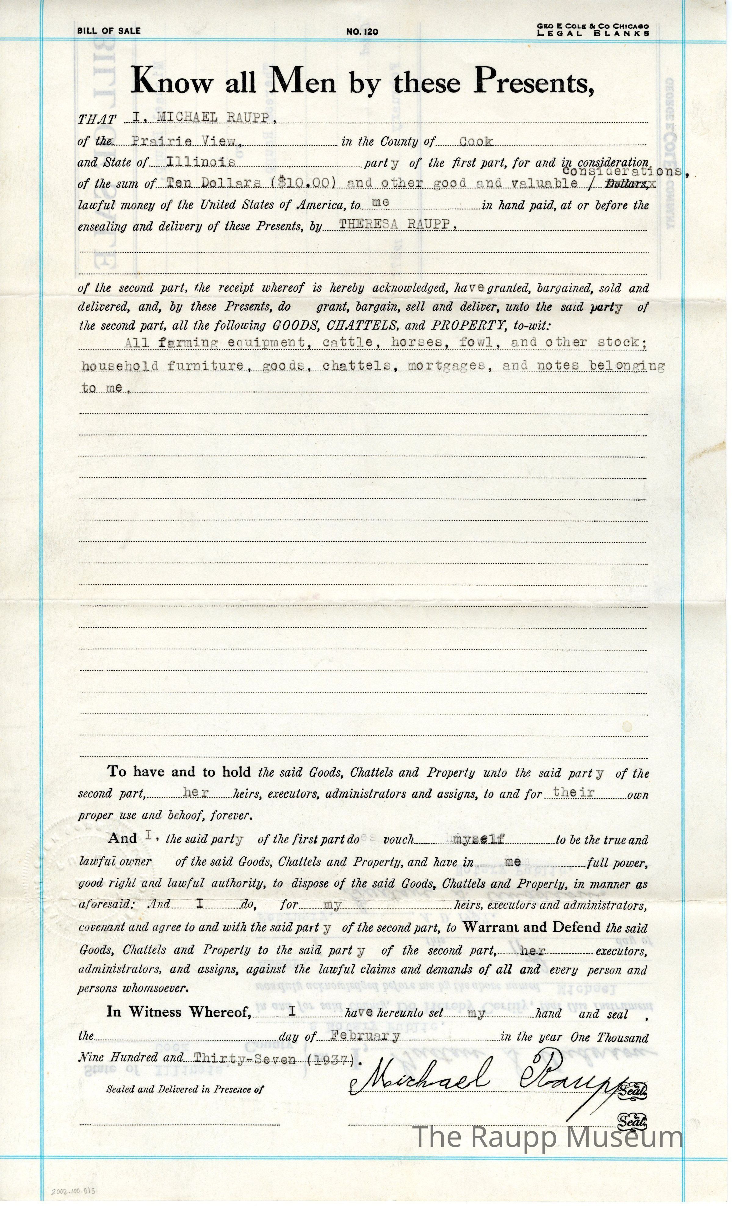 One (1) page double sided Bill of Sale for farming equipment, animals, household goods, and notes belonging to Michael Raupp to Theresa Raupp for $10.00. The document is a combination of pre-printed sections and typed in sections, with handwritten signature. The top has printed "Know all Men by these Presents". There is a double lined blue border on bill of sale. On back is the notary public signature and statement, with the "Bill of Sale" title for when document is folded.Archive Details