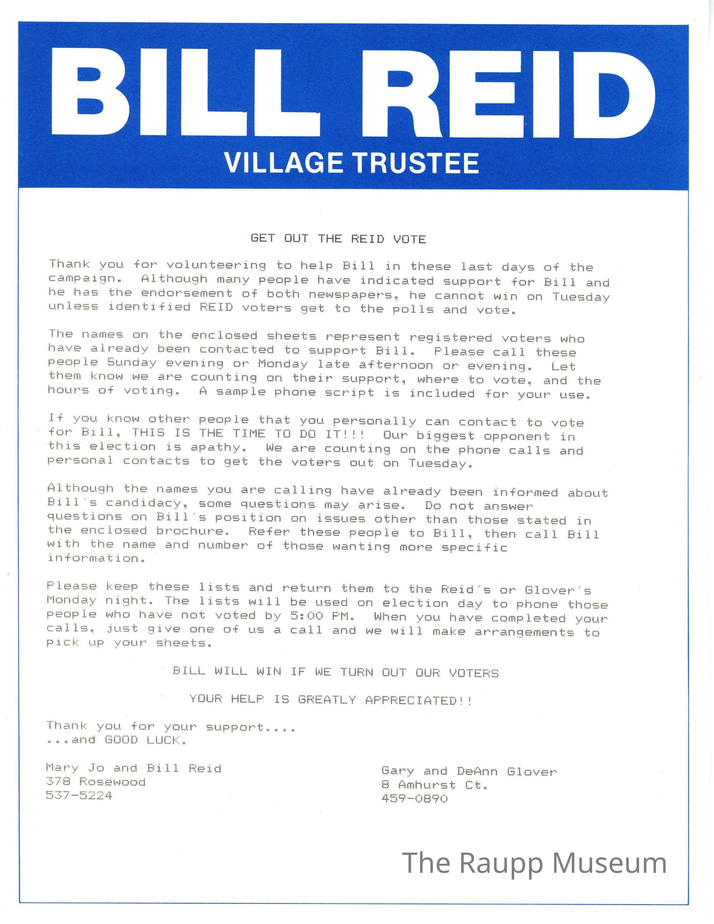 One (1) one page newsletter to Bill Reid supporters ahead of the election to Village Trustee. Contains blue header with white text and typed letter to Gary and DeAnn Glover.