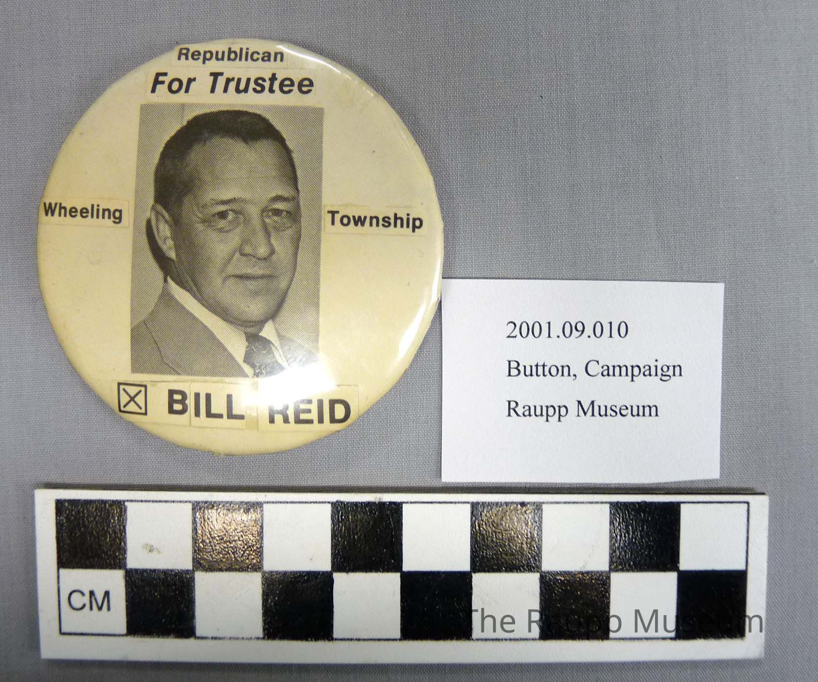 One (1) round metal political button, with a white background and photo of man from shoulders up (glued on) and text (glued on) in black: "Republican for Trustee Wheeling Township X Bill Reid". On the back is "RPM Assoc., Badge-a-Minit, La Salle, ILL 61301 etched". The back is silver with a safety pin attachement."Material