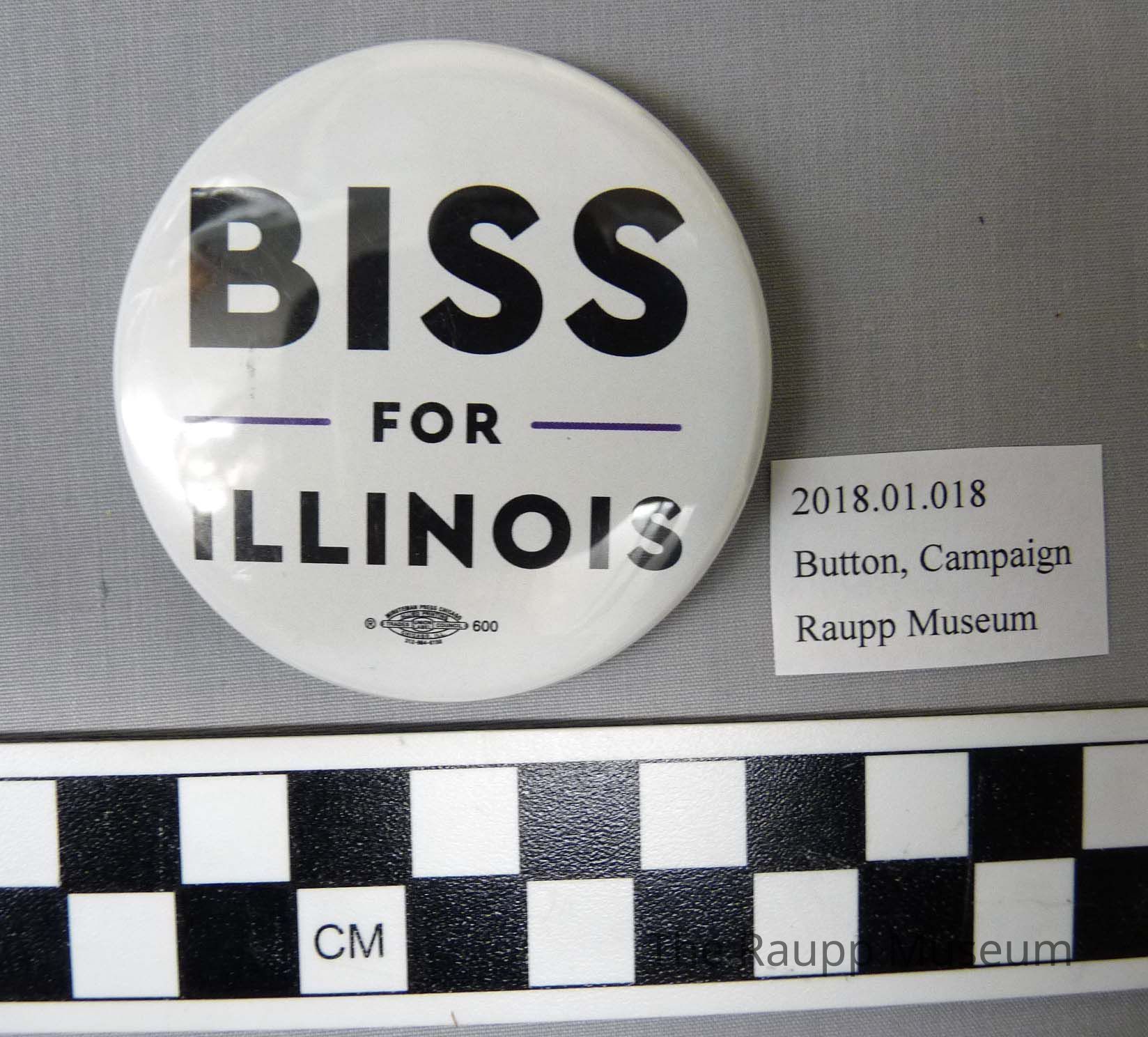 One (1) political button. The button has the text "Biss for Illinois" on one side, and silver metal on the back side. The button is white, purple, and black. There is a safety pin affixed to the back.Condition