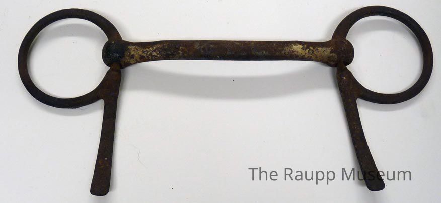 One (1) brown metal, mullen half cheek style bit. The object is H shaped: two hinged verticle posts either side of a bar mouthpiece. Side posts are "9" shaped, both have fixed rings on one end. This object is directly labeled on the back left of the center barDimensions