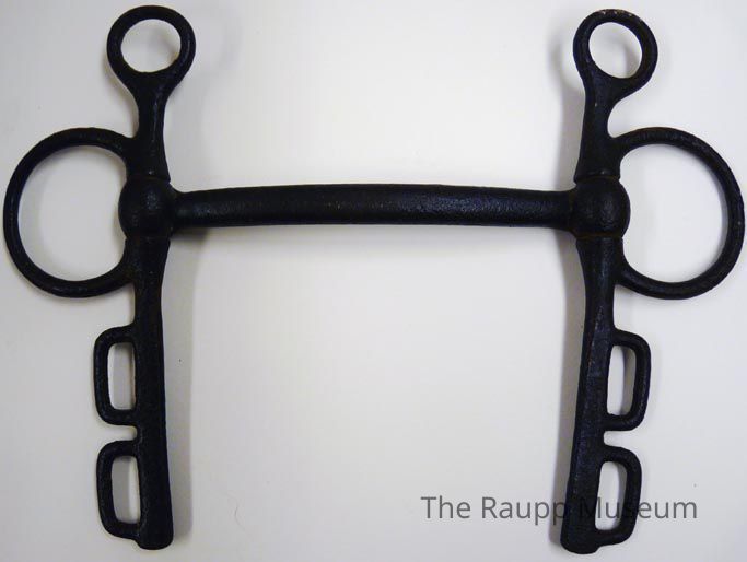 One (1) black and brown metal two slot Liverpool style driving bit. This object is H shaped: two verticle posts with round fixed rings and two rectangular fixed rings on either side of a slightly arched bar mouthpiece. Side posts are hinged. This object is directly labeled on the back left side of the center metal barDimensions