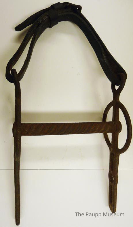 One (1) brown metal and leather bit in three slot Liverpool style. The bit it H shaped: two verticle posts with fixed round rings and rectangular and circilar fixed rings on either side of a twisted serrated bar mouthpiece. Leather strap is folded twice through the upper rings of the bit and buckled to hold in place. This object is directly labeled on the bottom of the center barDimensions