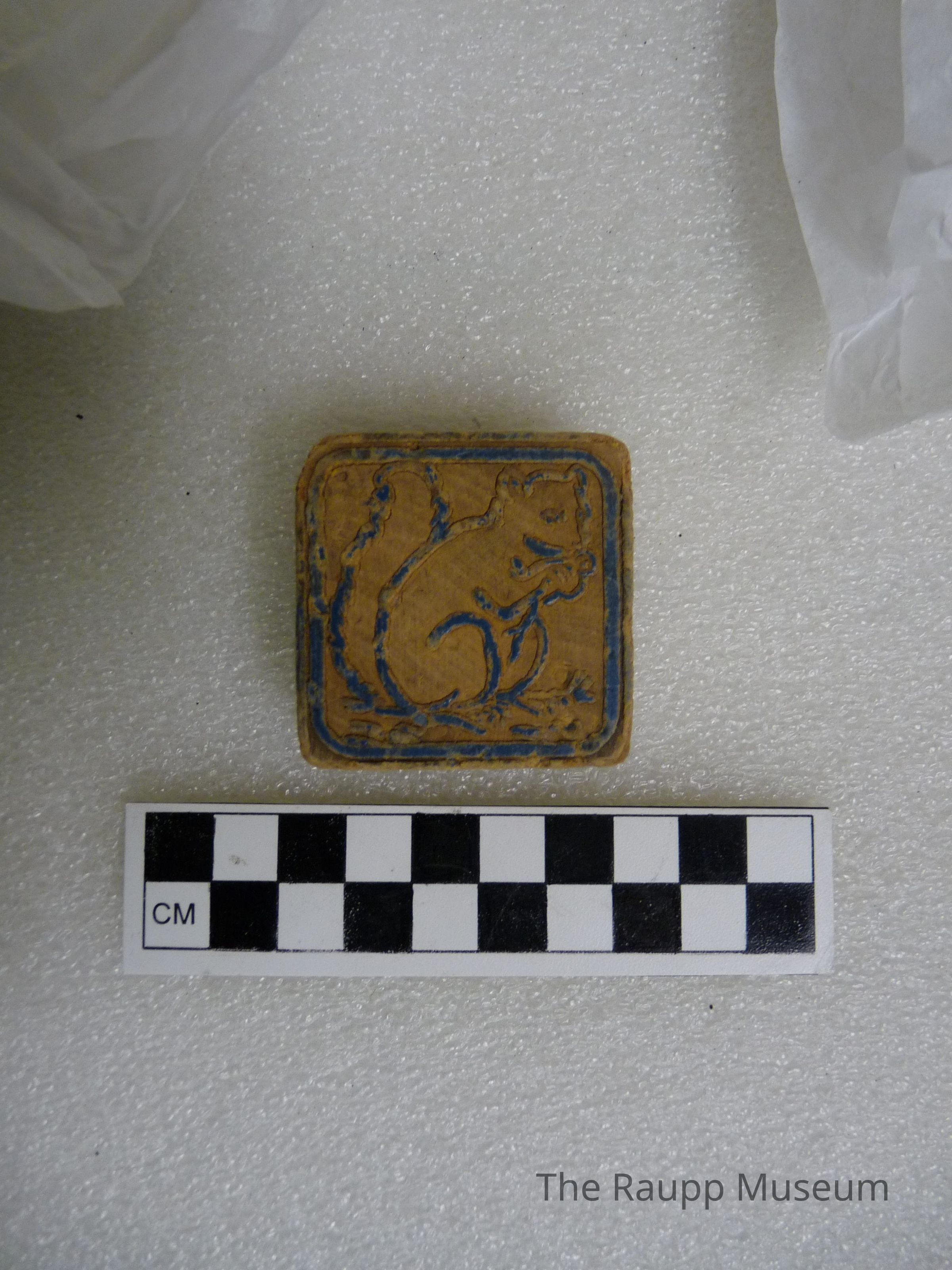 One (1) square red, blue and brown wooden block. This object has a red raised letter "P" on one side along with a red raised boarder, and a blue raised squirrel eating with a blue raised border. This object is directly labeled on the bottomDimensions