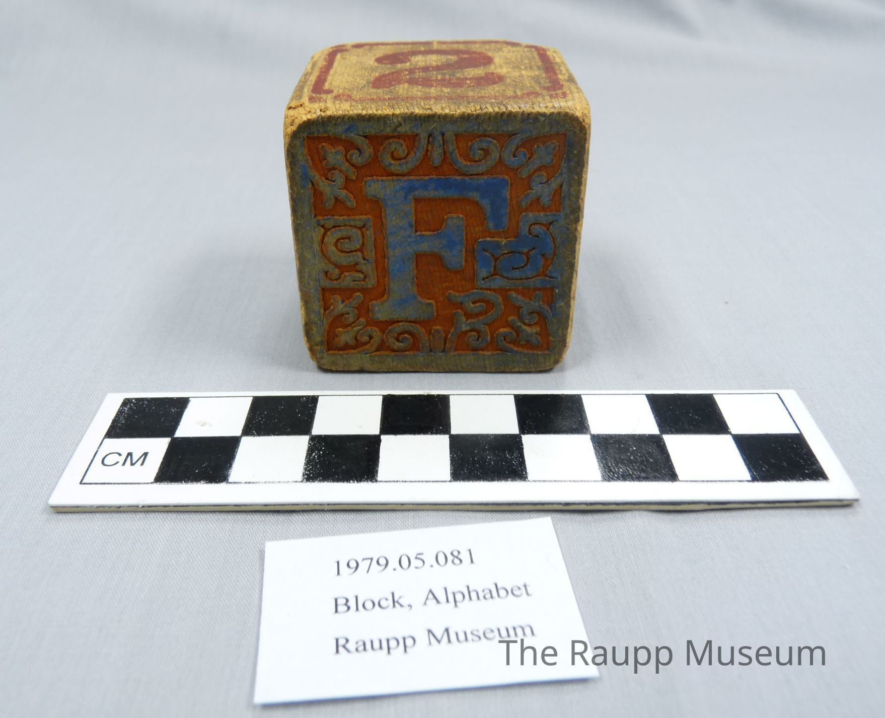 One (1) square red, blue, green, yellow, orange and brown wooden block with 6 sides. This object has a red raised letter "P" on one side along with a red raised decorative border, a blue raised "F" with a blue raised decorative border. One side has a red painted "2", one side a blue painted man on a camel, and another side a green painted/stamped beaver. One side is blank. This object is directly labeled on the bottom with paper and black ink.Dimensions