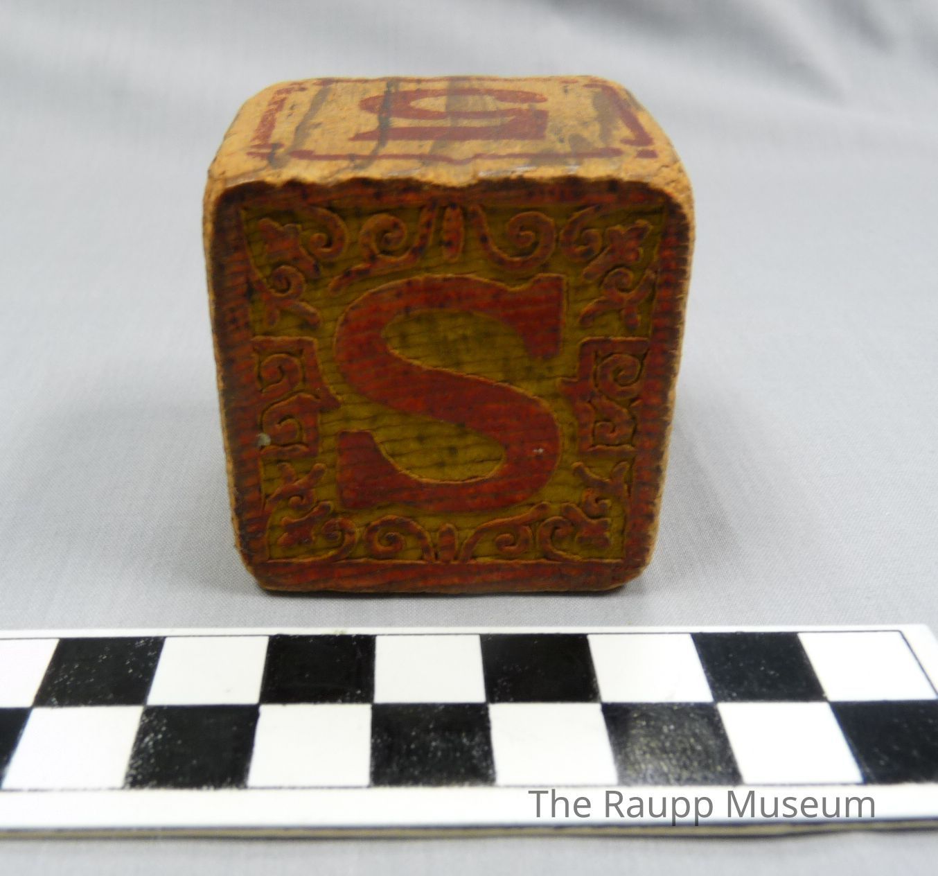 One (1) square red, blue, green, yellow, orange and brown wooden block with 6 sides. This object has a red raised letter "S" on one side along with a red raised decorative border, a blue raised "A" with a blue raised decorative border. One side has a red painted "5", one side a blue painted goat, and another side a green painted/stamped dog. One side is blank. This object is directly labeled on the bottom with paper and black ink.Dimensions