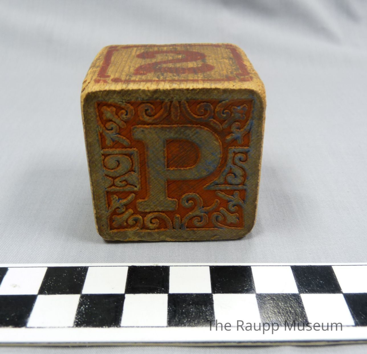 One (1) square red, blue, green, yellow, orange and brown wooden block with 6 sides. This object has a red raised letter "F" on one side along with a red raised decorative border, a blue raised "P" with a blue raised decorative border. One side has a red painted "2", one side a blue painted cat, and another side a green painted/stamped elephant. One side is blank. This object is directly labeled on the bottom with paper and black ink.Dimensions