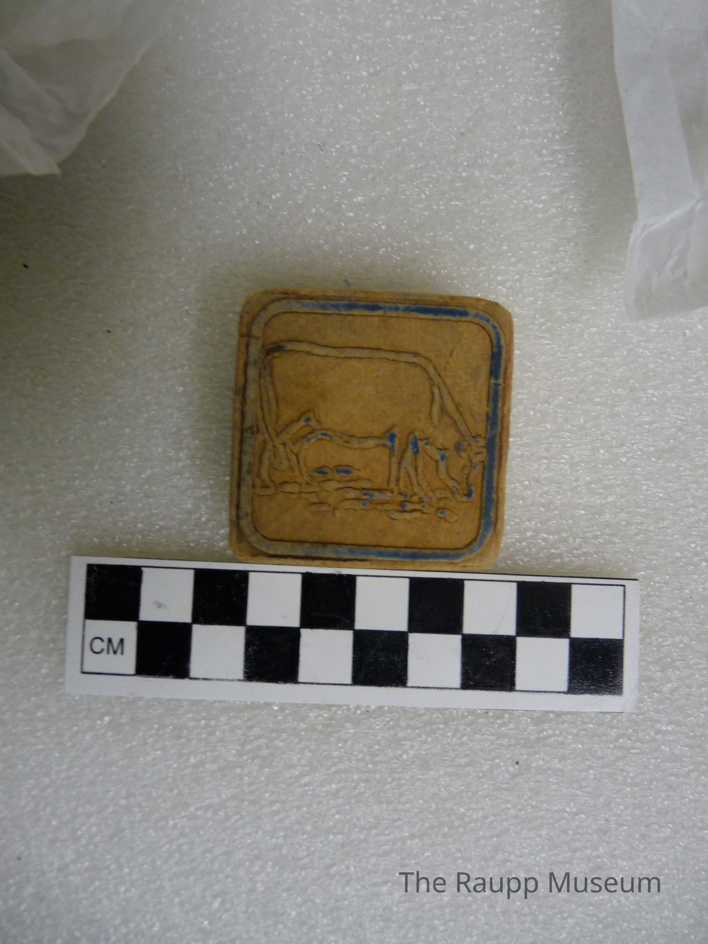 One (1) square red, blue and brown wooden block. This object has a red raised letter "F" on one side along with a red raised boarder, and a blue raised cow with a blue raised boarder. This object is directly labeled on the bottomDimensions