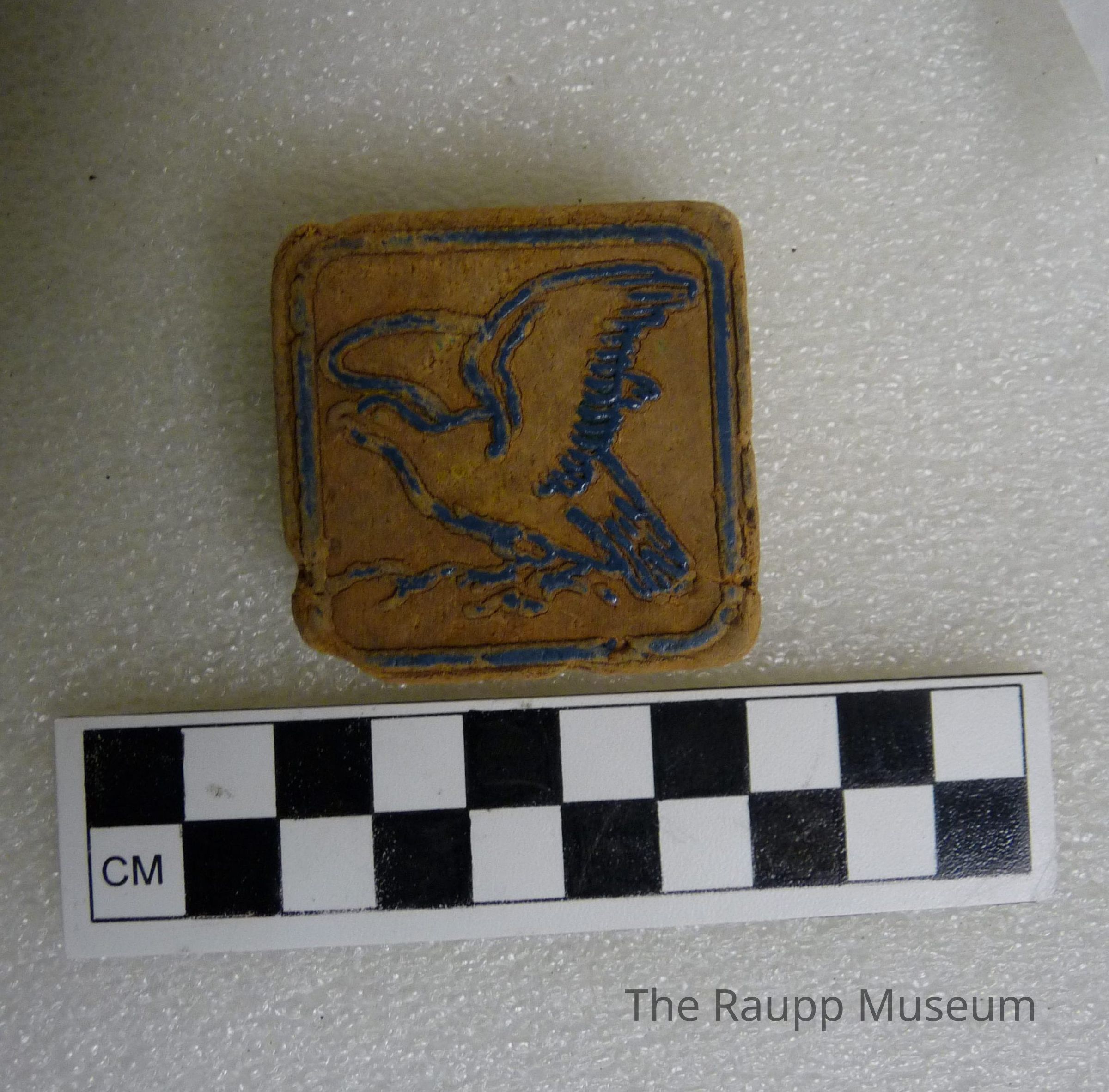One (1) square red, blue and brown wooden block. This object has a red raised letter "V" on one side along with a red raised boarder, and a blue raised eagle with a blue raised border. This object is directly labeled on the bottom.Dimensions