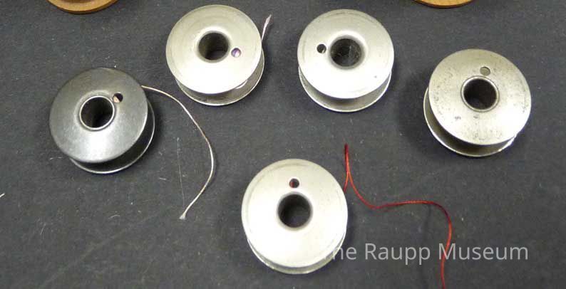 Group of five silver colored bobbins and a silver colored thimble: four bobbins with color thread, one empty. Originally cataloged as UNNUMBERED-278 “miscellaneous from sewing machine drawer."Dimensions