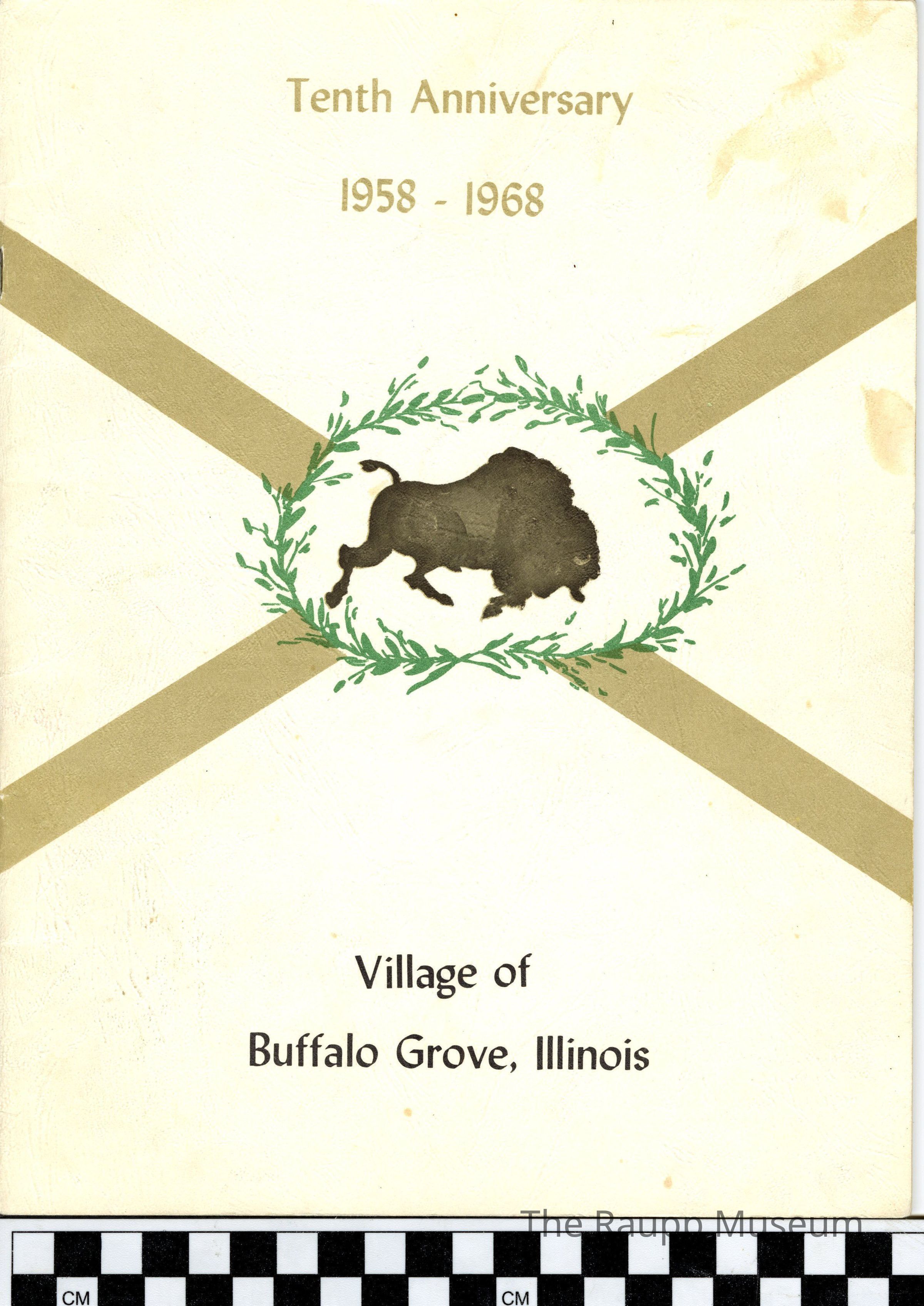 One (1) tenth anniversary booklet for the celebration of the Village of Buffalo Grove. Contains photos and history of the village and important people. The cover has a buffalo with wreath design around it in a golden "X". Contains 40 pages.