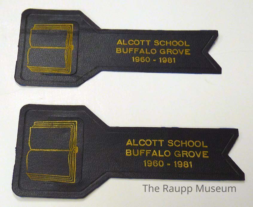 Group of 25 identical navy blue arrow shaped bookmarks with gold line drawings of an open book and gold print. With page flap around the book. Front is textured plastic, back is felt-like or construction paper. Used at the closing of Alcott School.