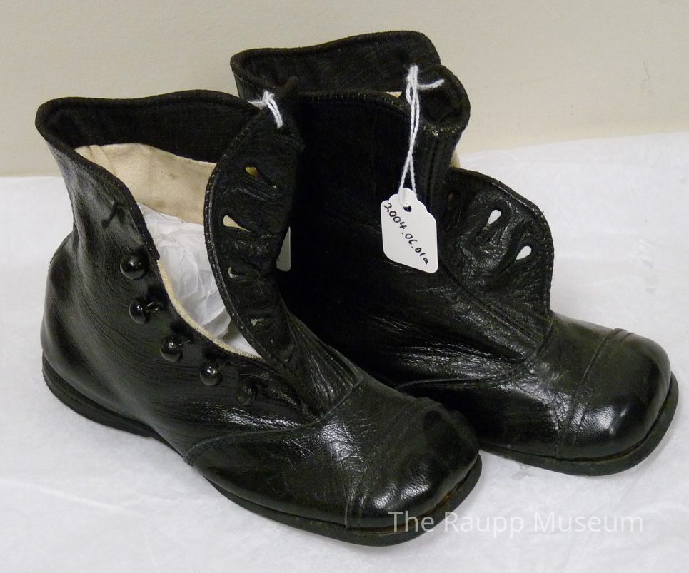 Group of two black patent boots for a child with square toes and six buttons and eyelet closures. "6 1/2" stamped on sole of both shoes and "6 1/2" and "510" on shoe interiors. White cloth lining.Dimensions