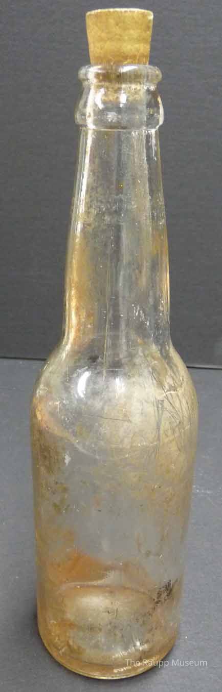 Clear round glass bottle with long neck and cork top. The cork has embossed word "Hilex" on the top. Bottle has two mold seams with embossed "8" on the base. Heavily soiled interior and general discoloration.Dimensions