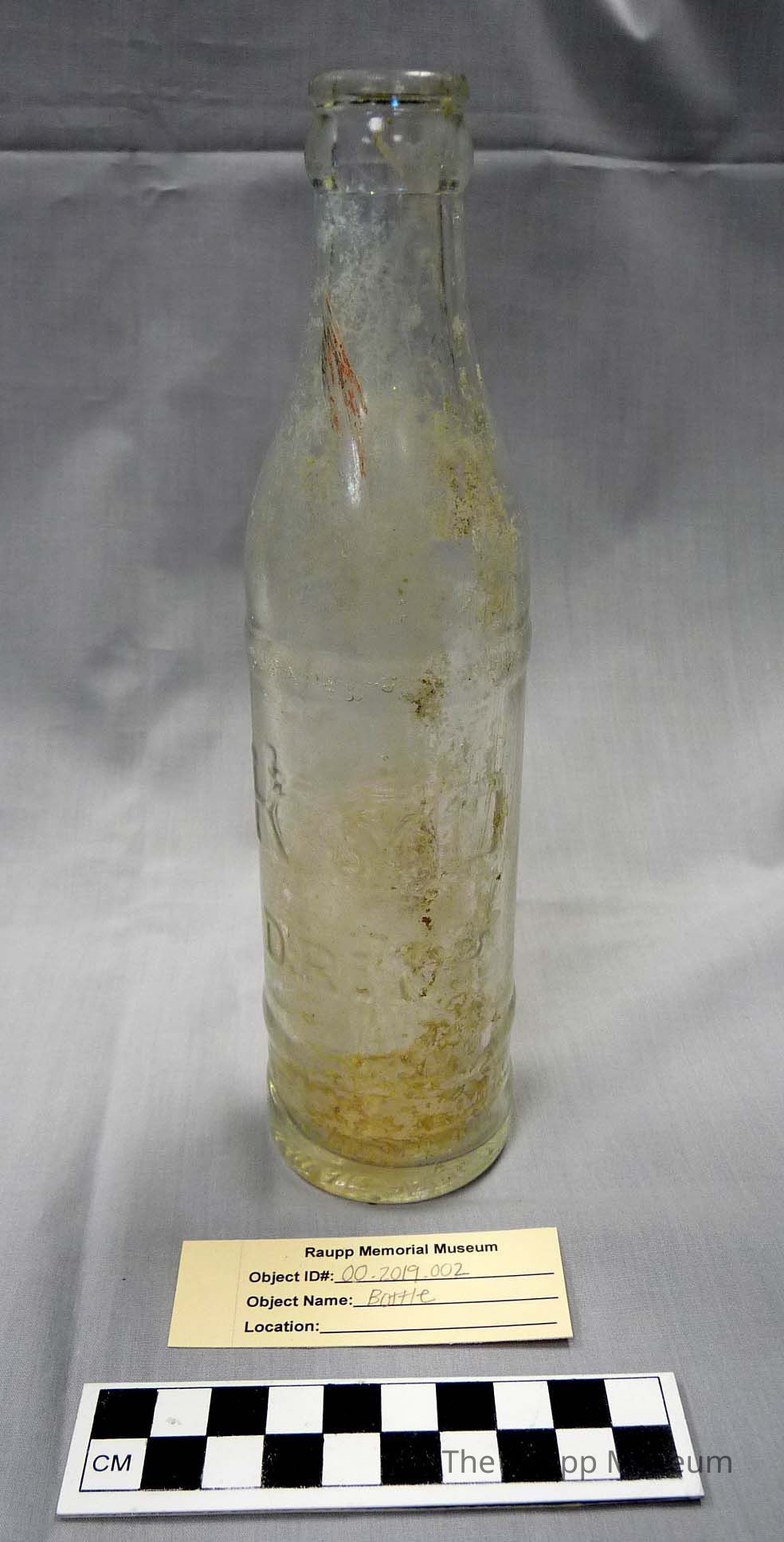 One (1) clear glass bottle, embossed in the center with "KAY O DRINK". The bottle is rounded with a thin neck and rim opening. There is an raised embossed ring decoration near the bottom and top center of the bottle. The bottle is embossed with "Chocolate Prod Co , Chicago ILL", and numbers "1...65...8" Some numbers are illegible. Along the bottle is embossed "Contents 7 flu ozs".Dimensions